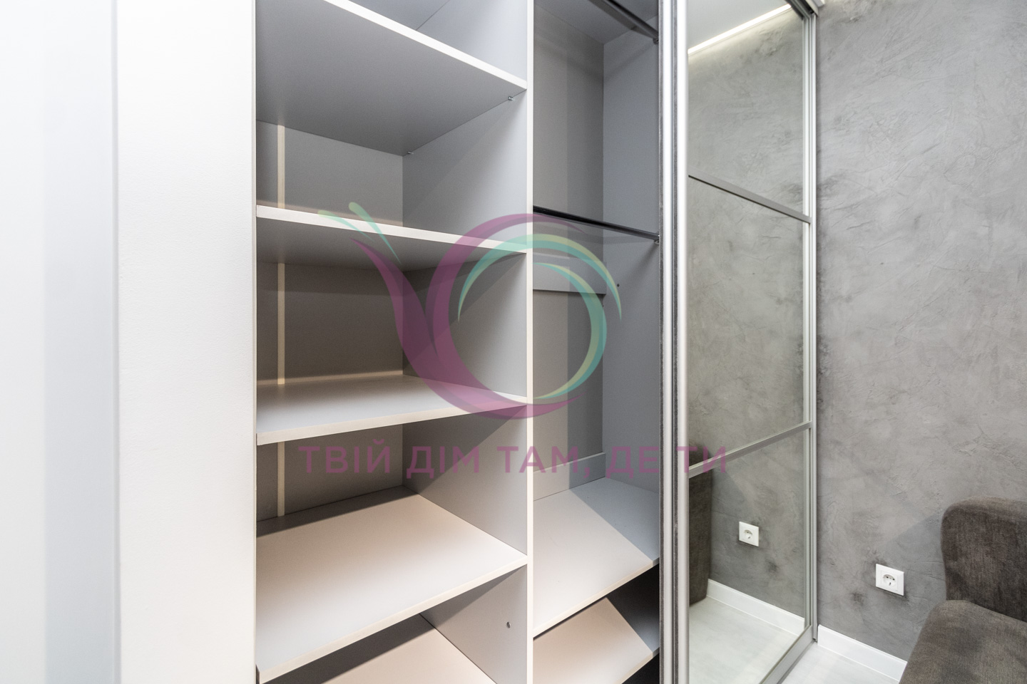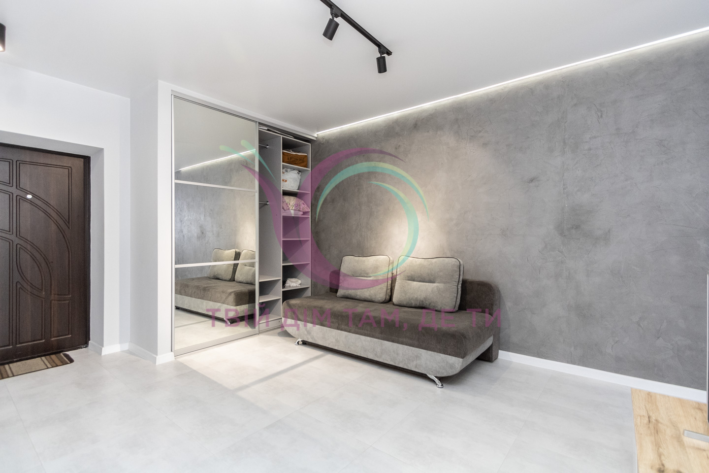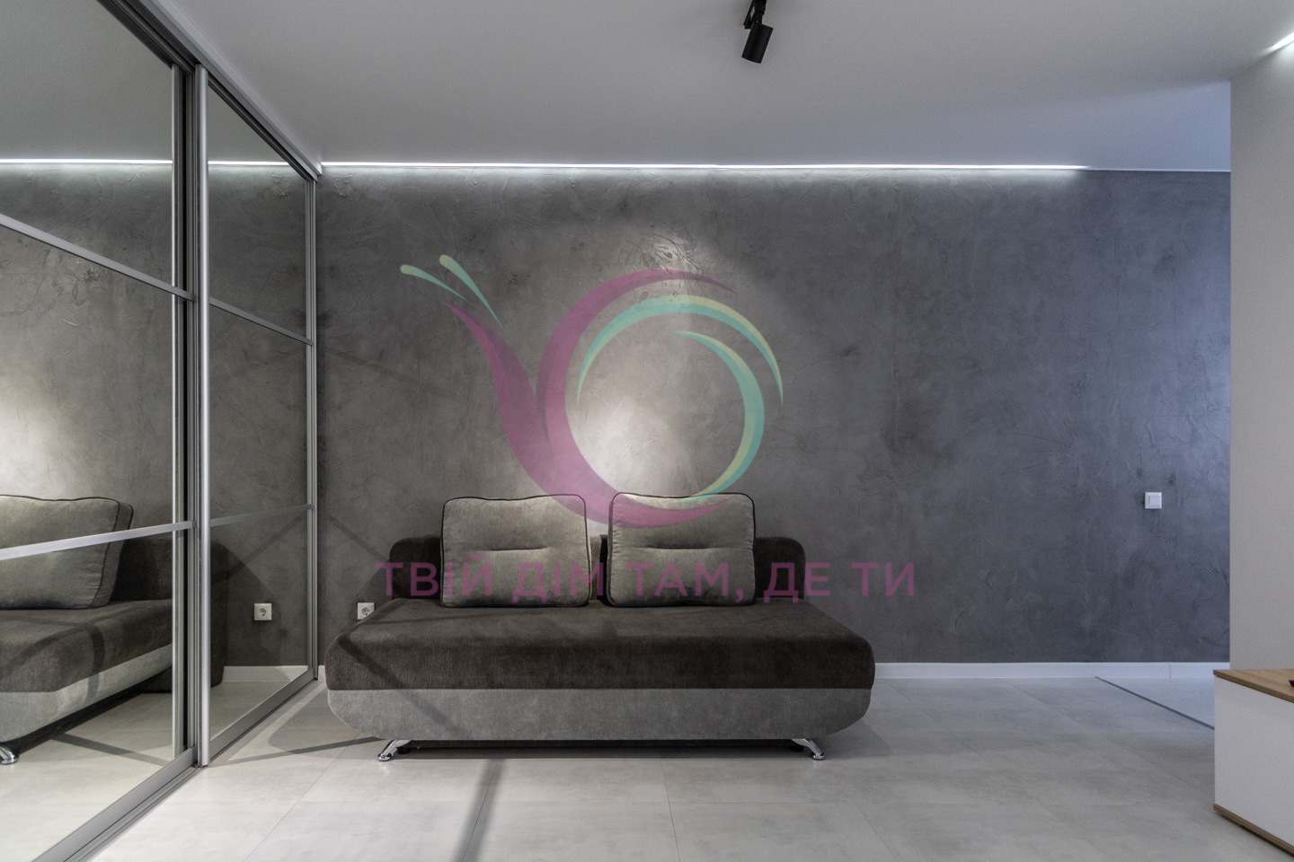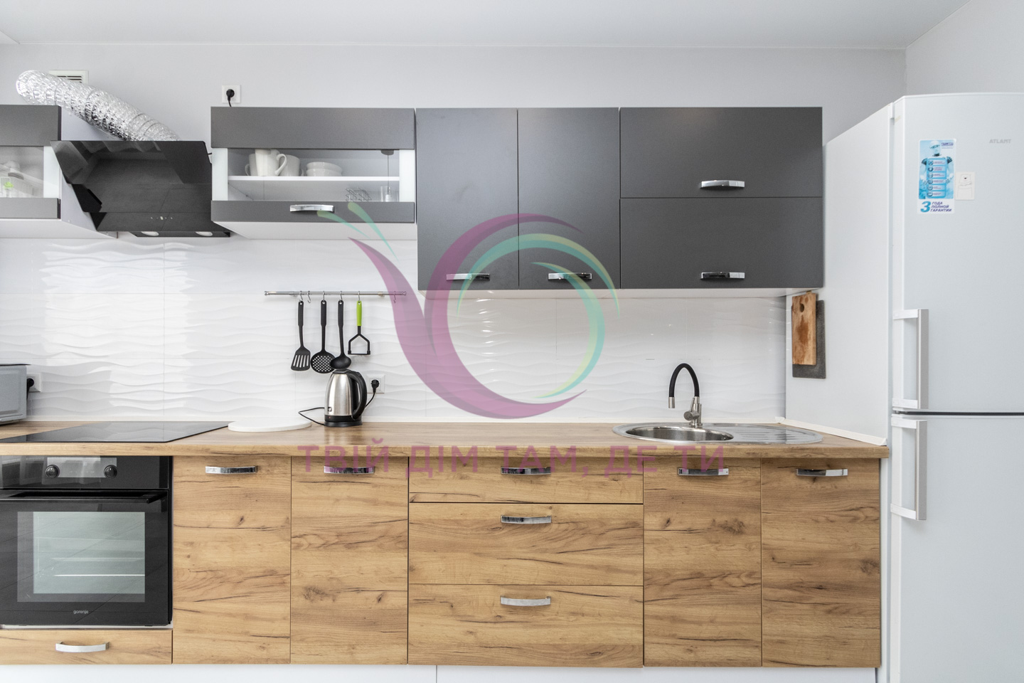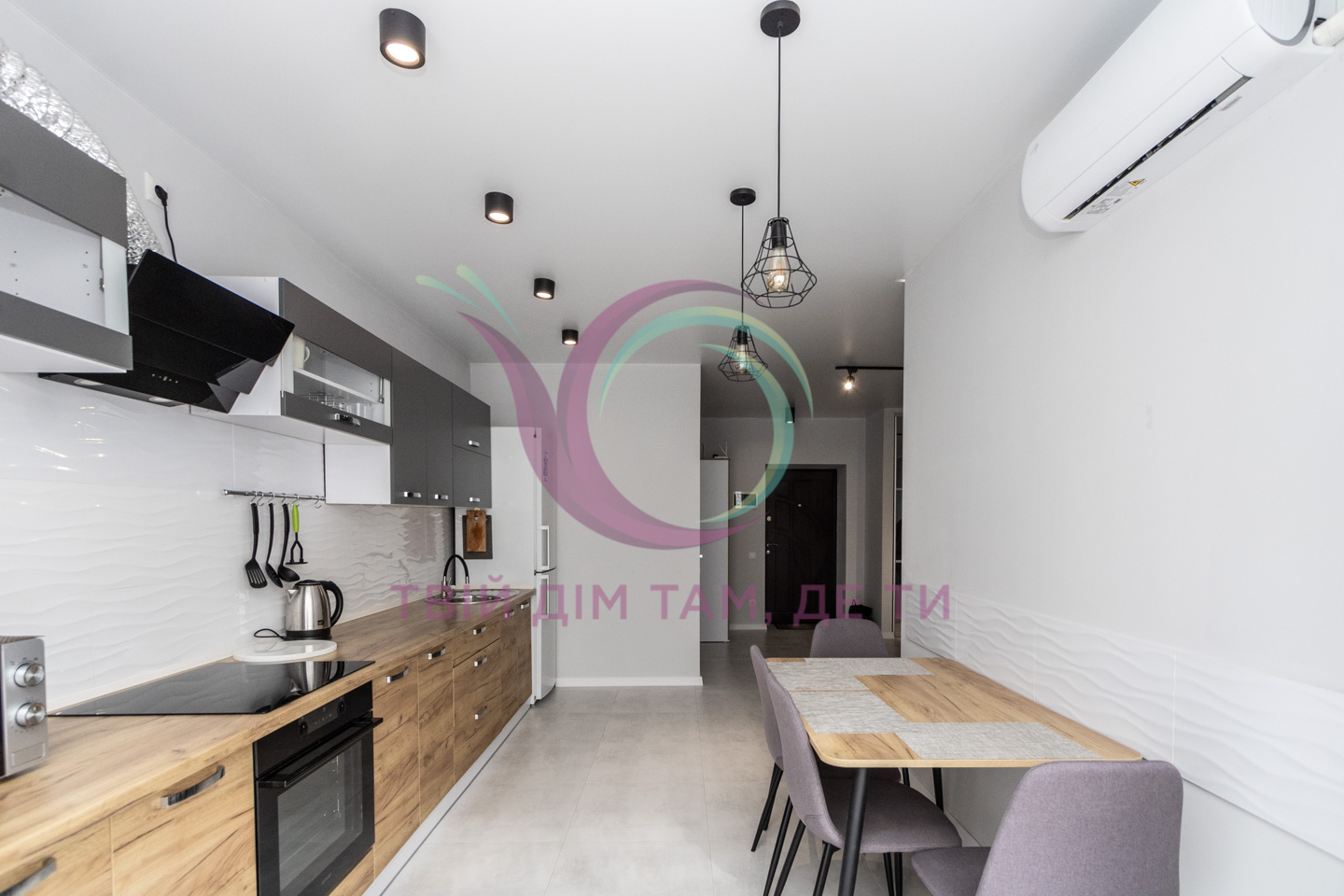Затишна квартира-студія з сучасним стильним ремонтом та цікавим дизайном. На просторій кухні розташовані якісні меблі з поверхнями для приготування їжі, а також варильна панель, витяжка та холодильник.
