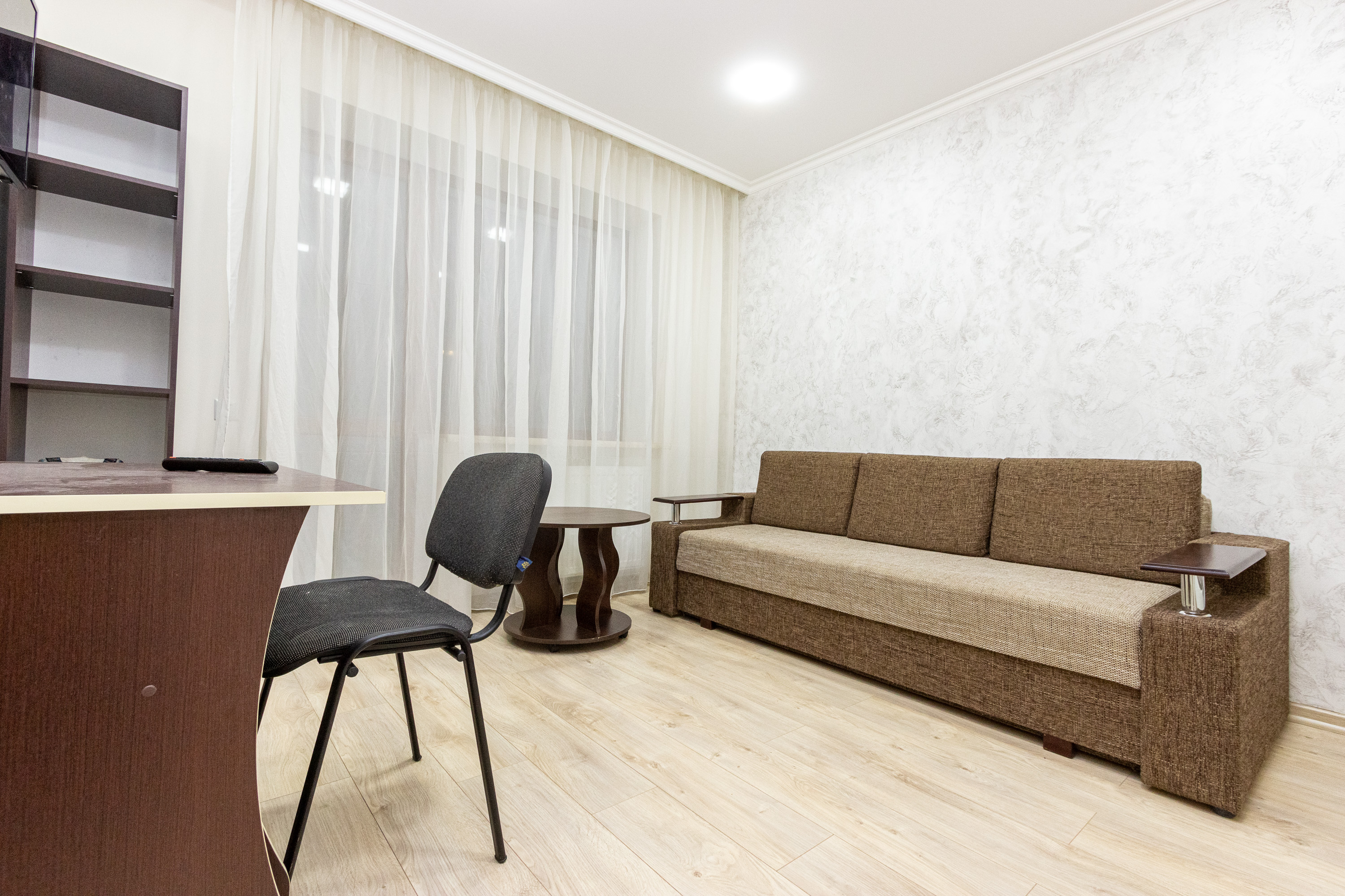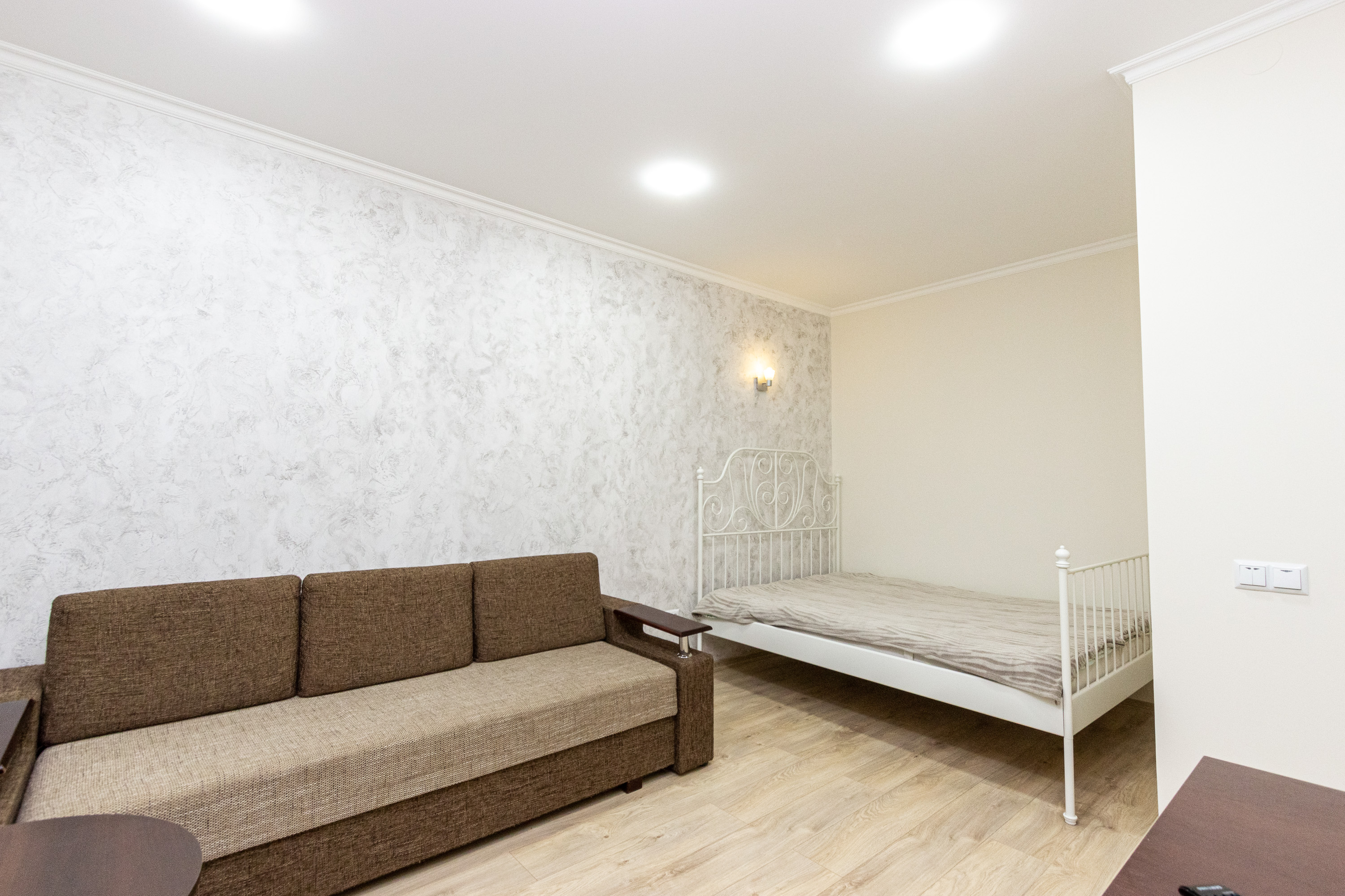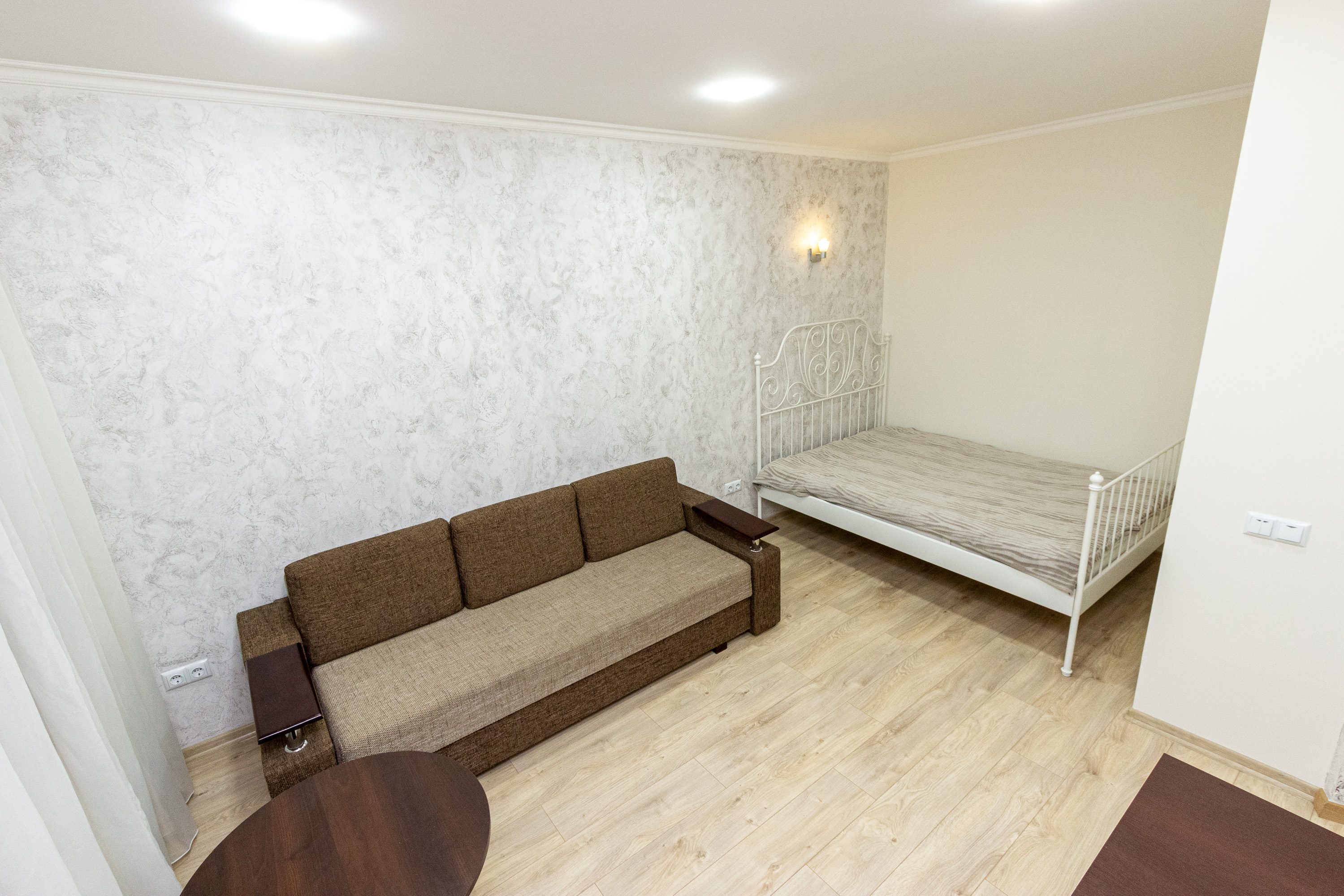 У кімнаті не тільки велике двоспальне ліжко, на якому так зручно засинати, а і розкладний диван. Навпроти на стіні плазмовий телевізор - переглядайте улюблені фільми чи телепрограми після складного робочого дня. Там і робочий стіл зі стільцем, щоб Ви мали місце та можливість працювати з дому або займатися важливими паперовими справами.