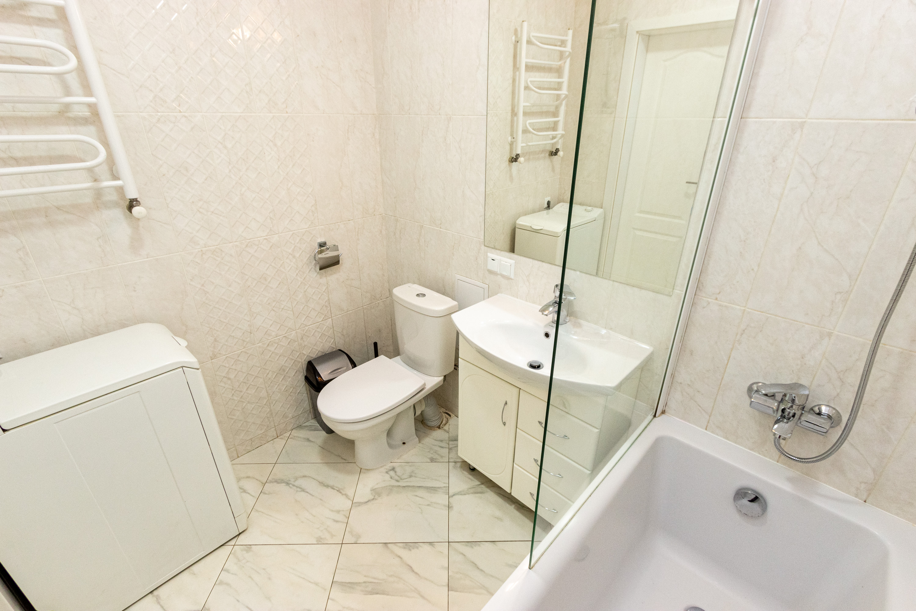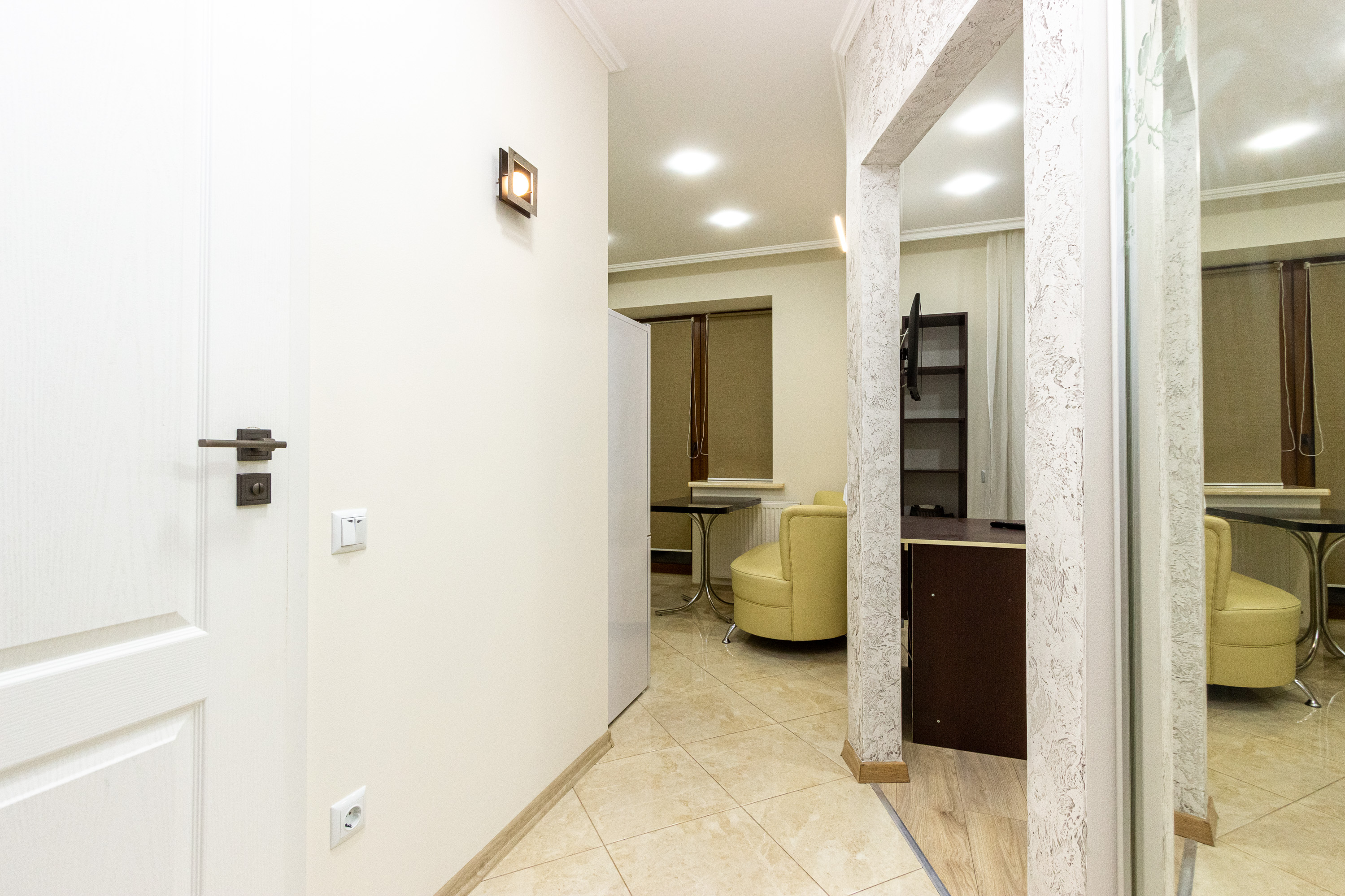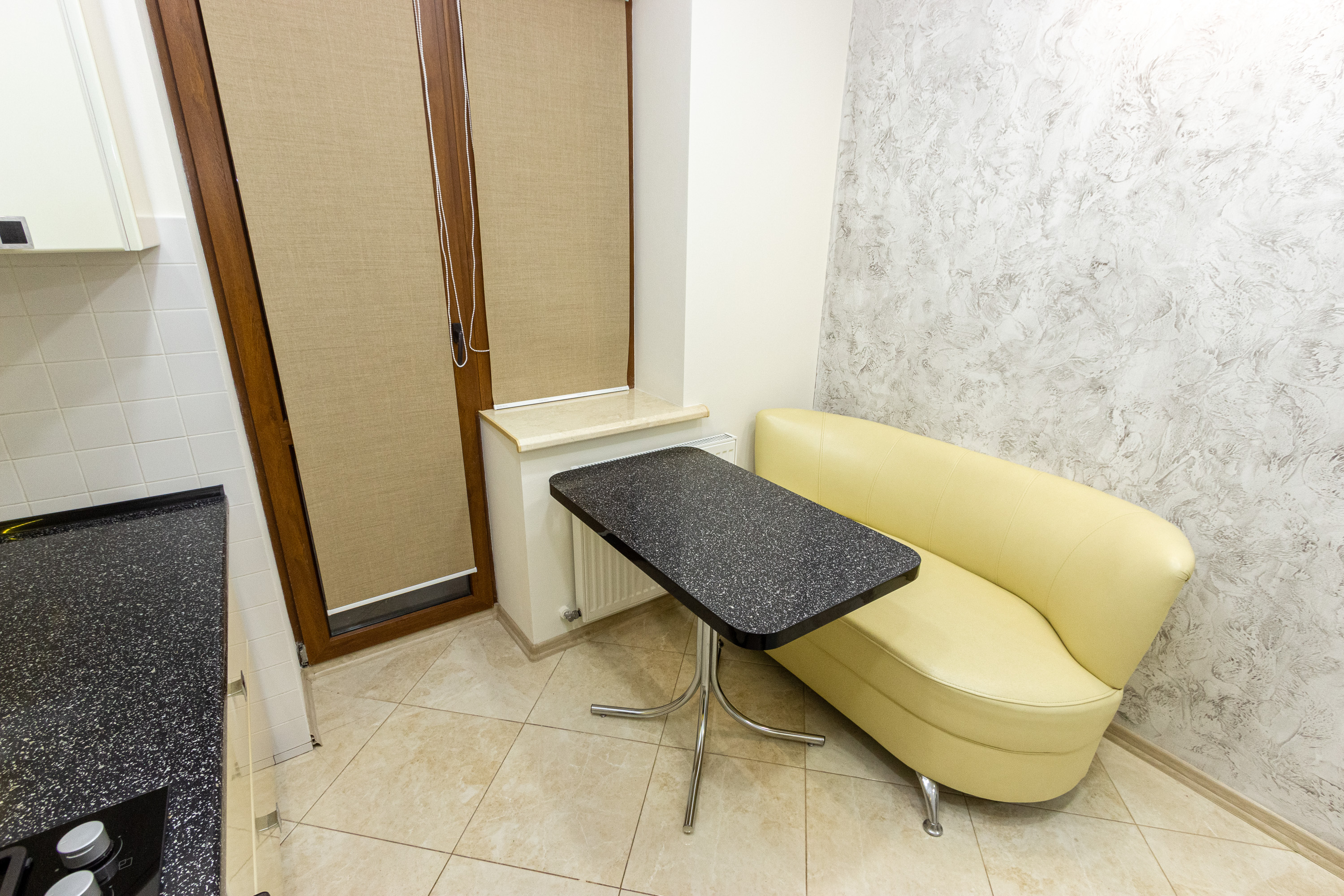 У кімнаті не тільки велике двоспальне ліжко, на якому так зручно засинати, а і розкладний диван. Навпроти на стіні плазмовий телевізор - переглядайте улюблені фільми чи телепрограми після складного робочого дня. Там і робочий стіл зі стільцем, щоб Ви мали місце та можливість працювати з дому або займатися важливими паперовими справами.