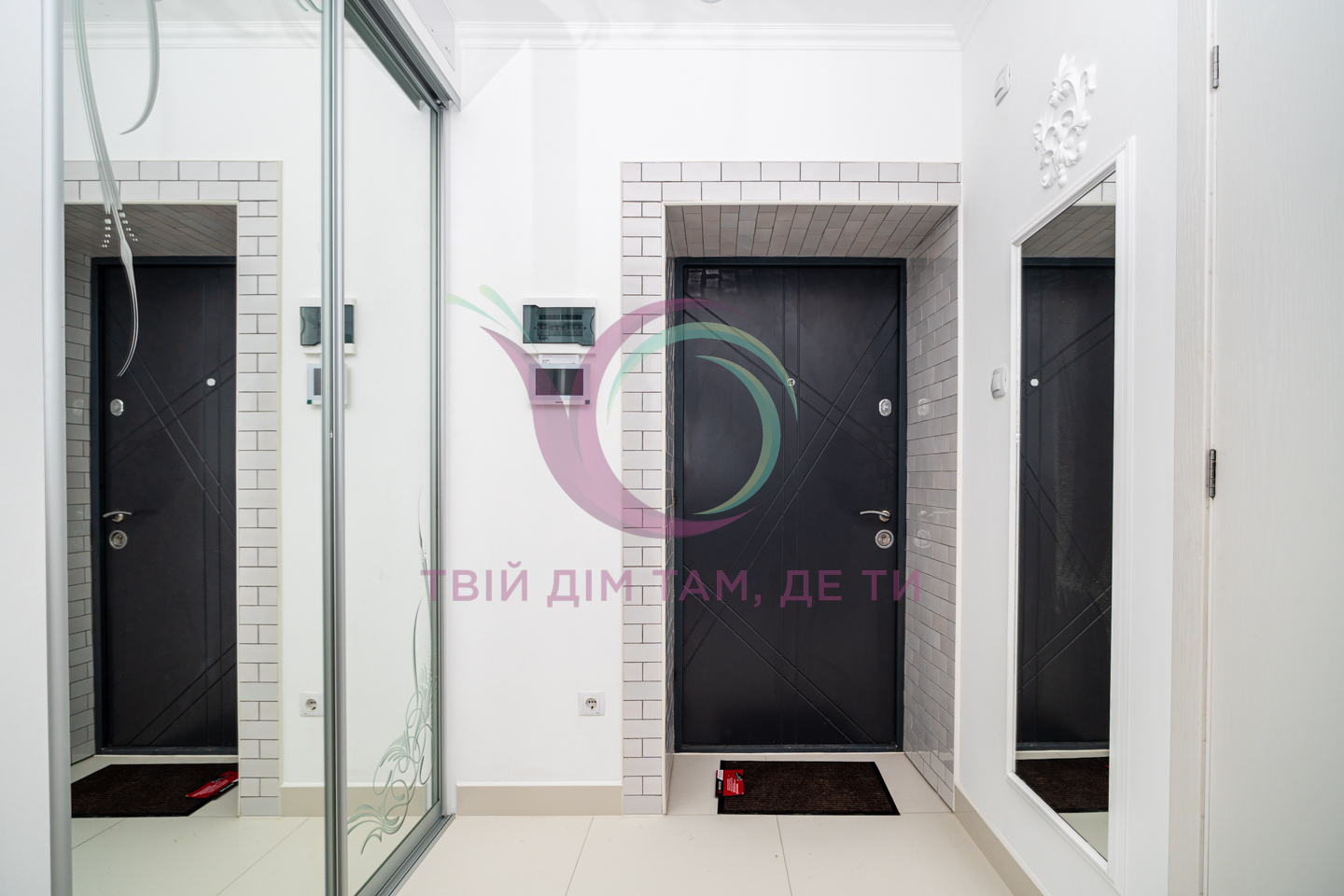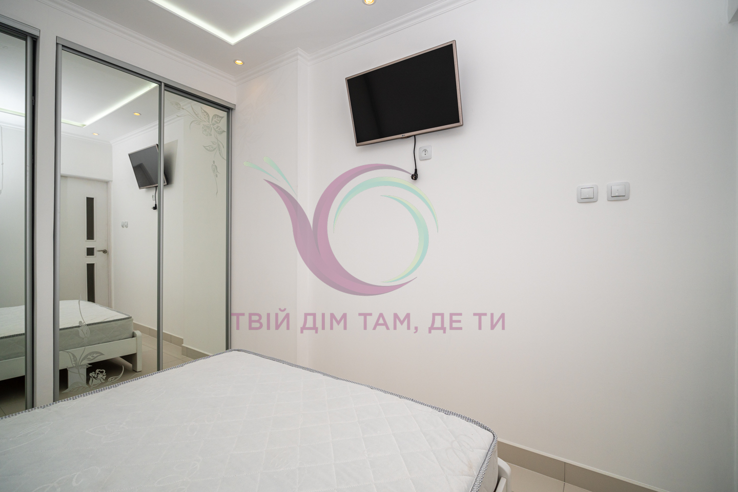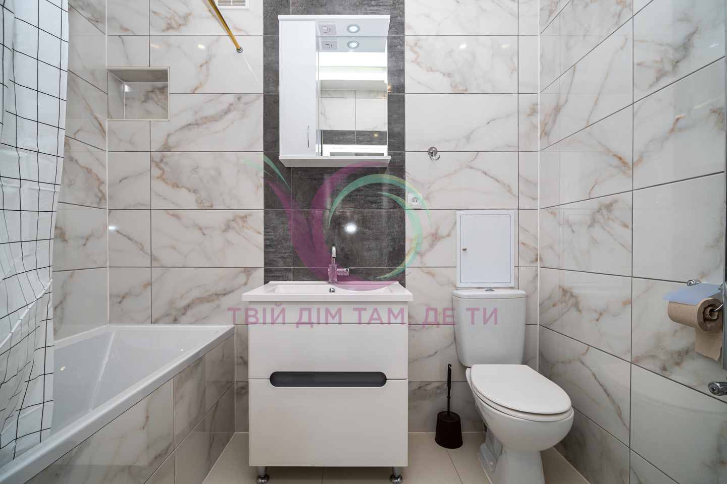 Стильна квартира з якісним ремонтом та сучасним дизайном інтер’єру має окрему спальну кімнату з міжкімнатними дверима та місткою шафою для речей. Кухня-студія площею 10 м2 обладнана шафами для посуду, холодильником, плитою, духовкою, витяжкою, має простору зону вітальні. Санвузол сумісний з ванною кімнатою має якісну сантехніку. Квартира укомплектована надійною побутовою технікою, підігрівом підлоги, індивідуальним опаленням, якісними меблями та усім необхідним для комфортного тривалого проживання.