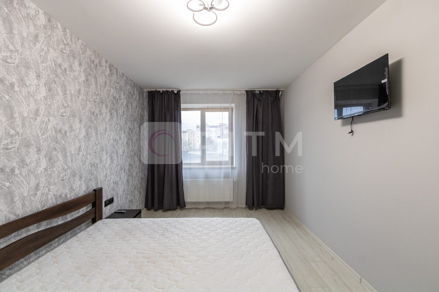 Спальна кімната затишна та світла — тут розміщене двоспальне ліжко, велика шафа для зберігання речей та телевізор.