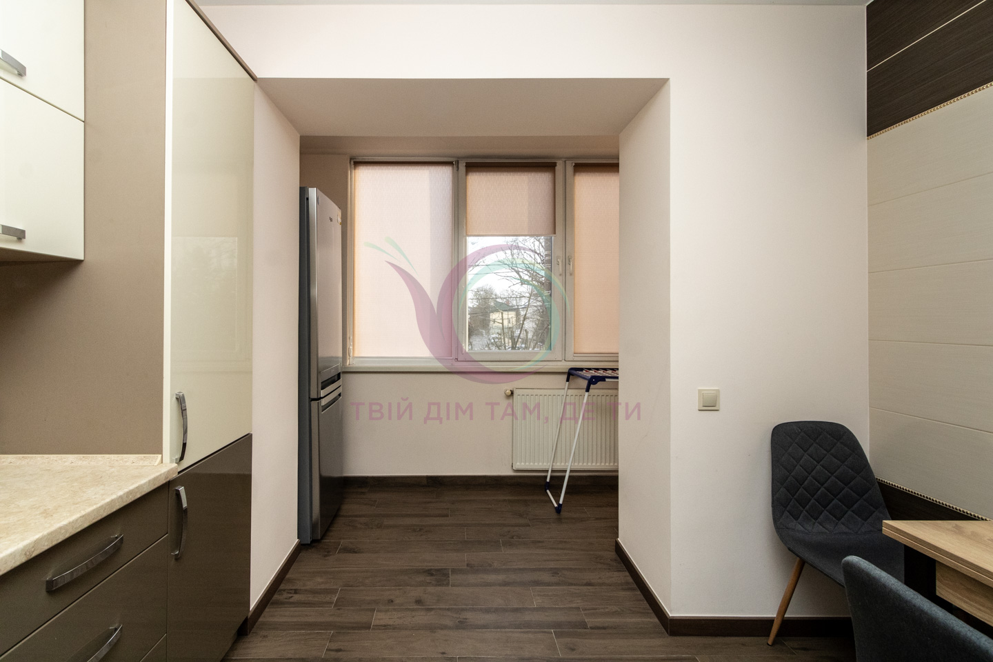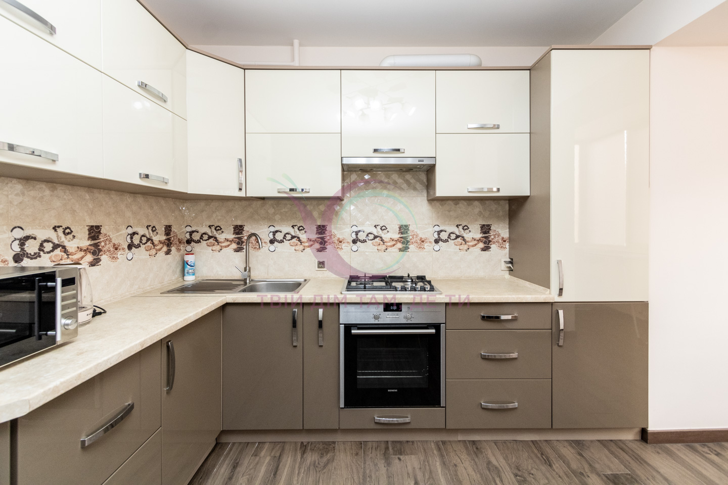 Кухня укомплектована шафами для зберігання посуду та побутовою технікою.