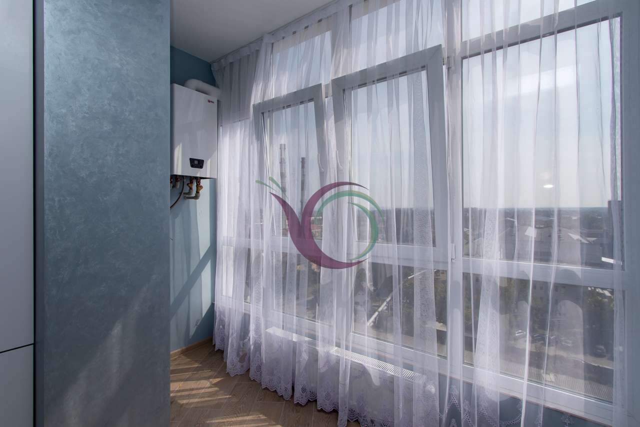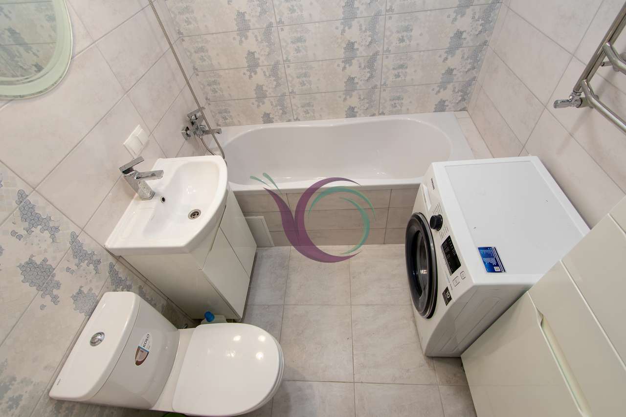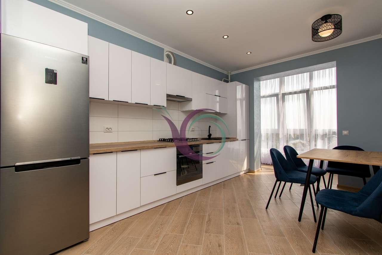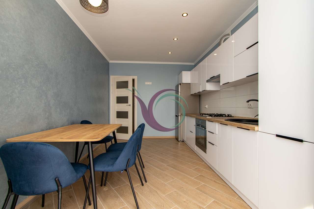 Спальна кімната з широким ліжком та новим ортопедичним матрацом, в іншій кімнаті є диван. Кухня з панорамними вікнами, є шафи для посуду, кухонна техніка та стіл зі стільцями. Санвузол з ванною та пральною машиною. Індивідуальне опалення заощадить кошти в холодний період.