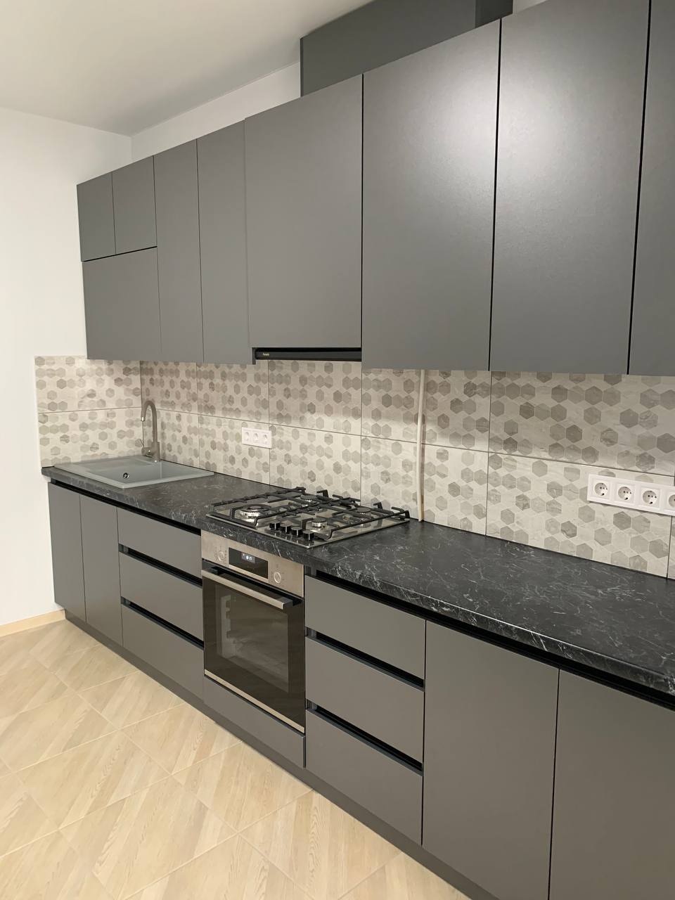 Кухонний простір обладнаний кухонним столом, сучасною поверхнею для приготування їжі, шафами для посуду та побутовою технікою (духова шафа, варильна поверхня, витяжка).