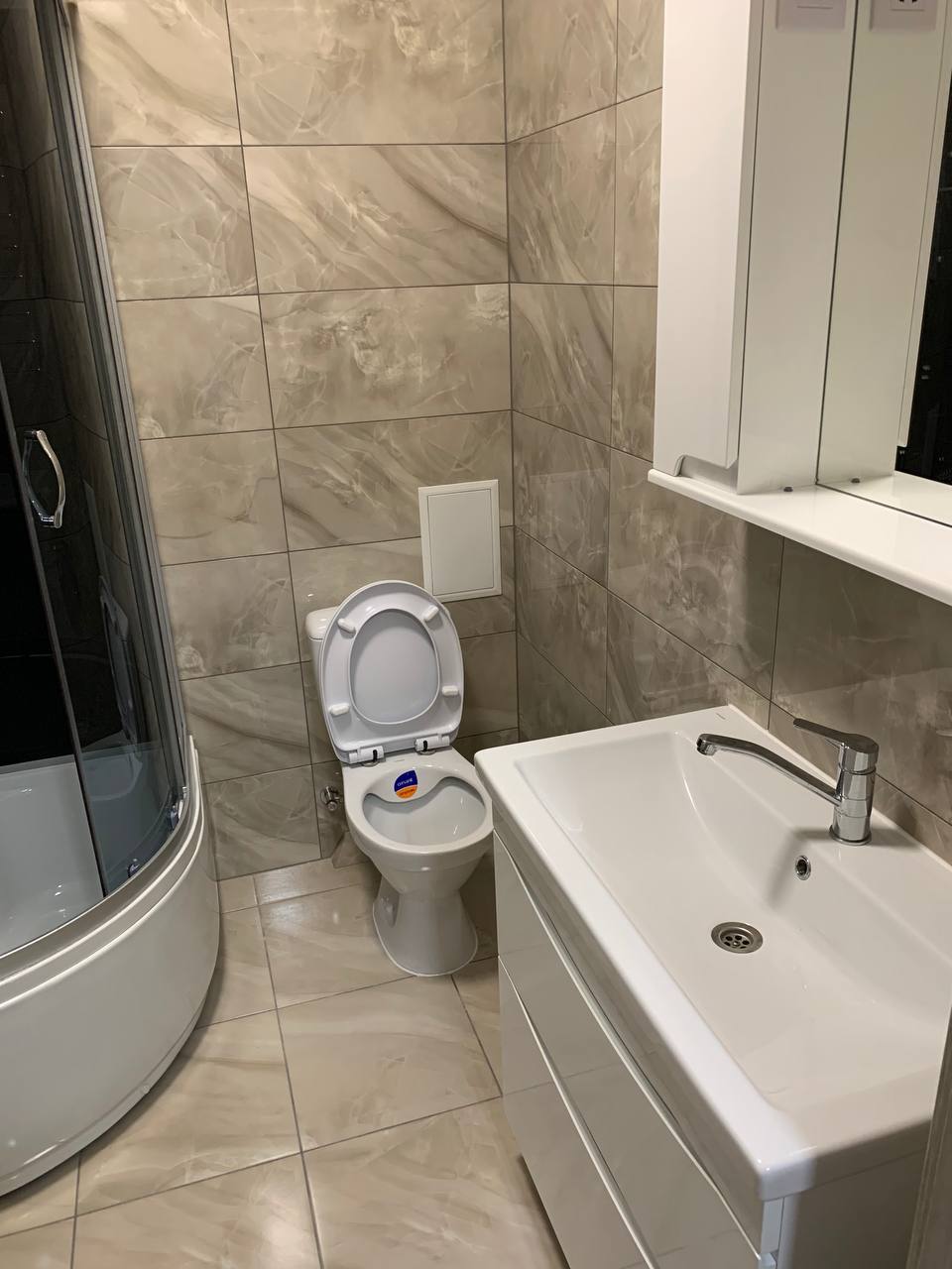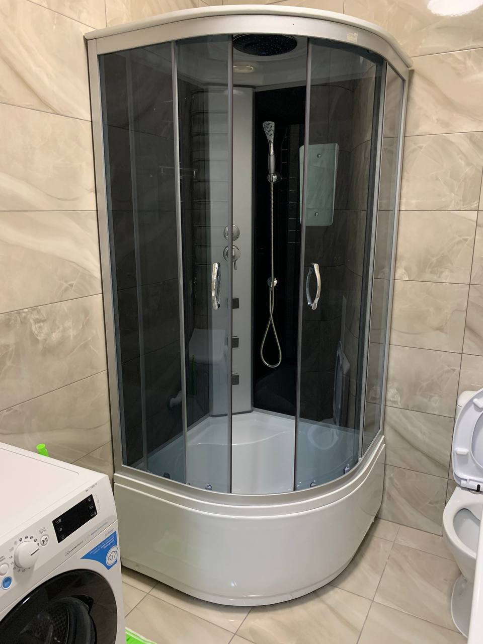 Світла ванна кімната має необхідну функціональну сантехніку, кутову душову кабіну, санвузол та пральну машину.