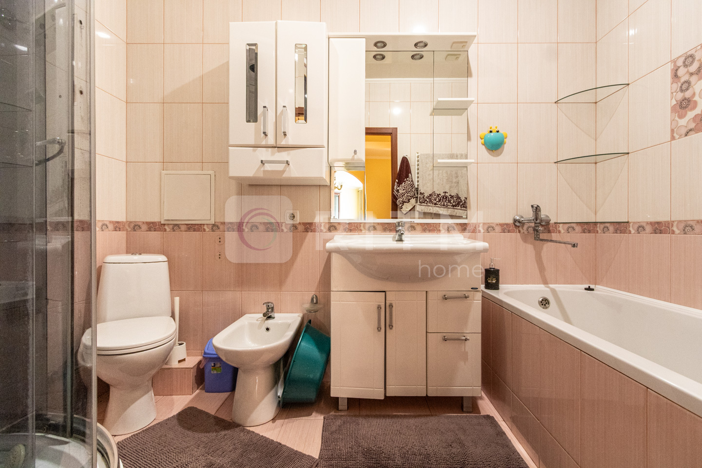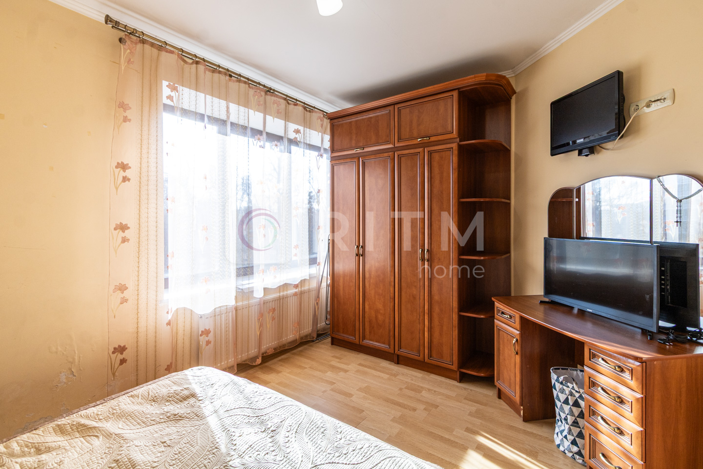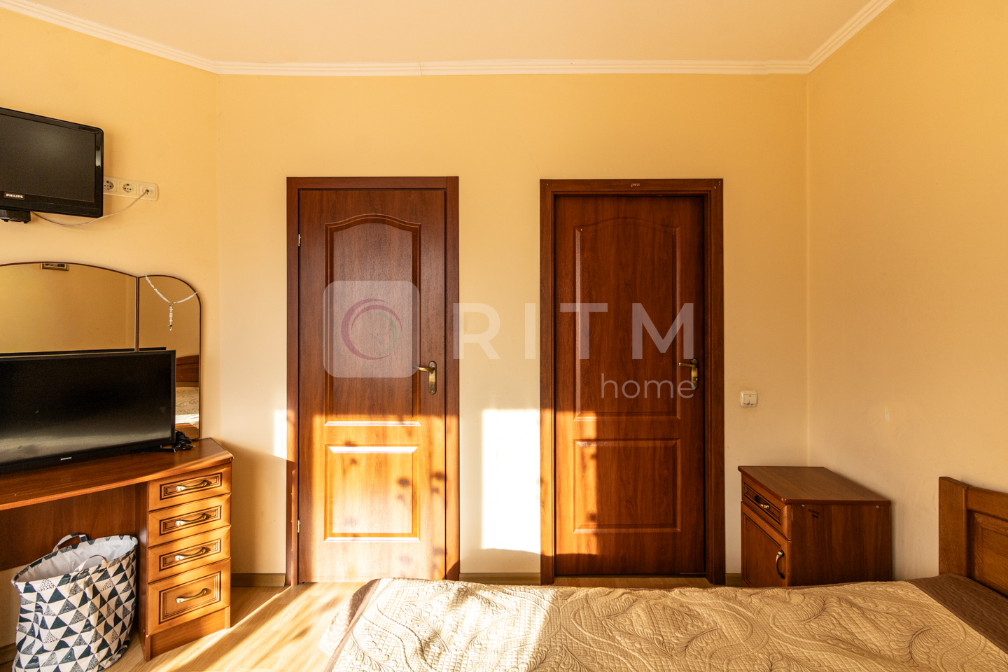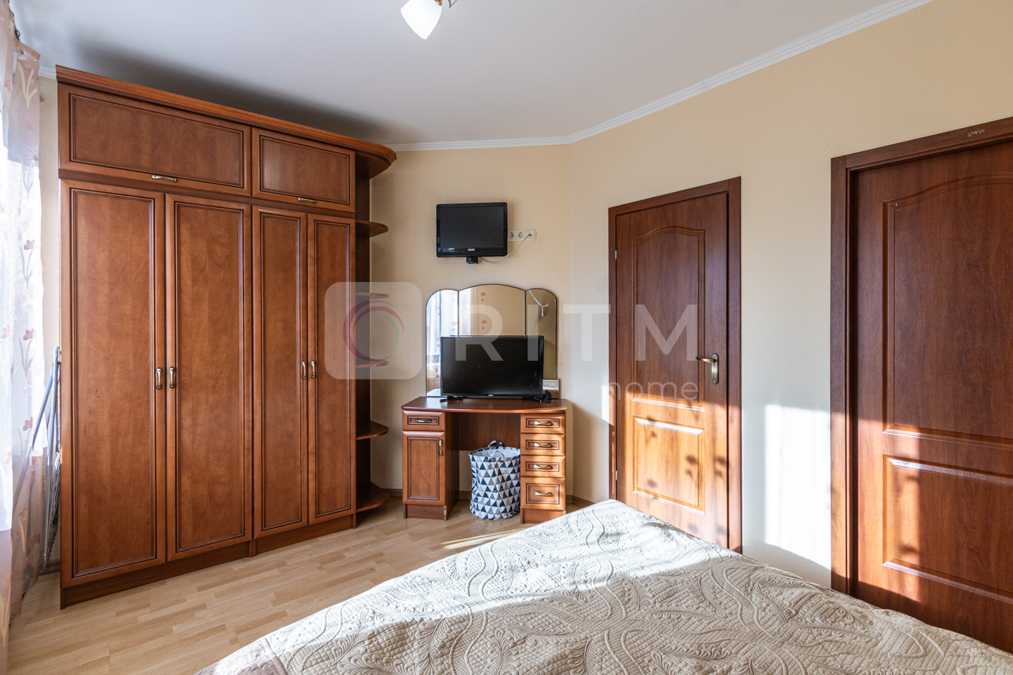 У спальні не тільки велике двоспальне ліжко. Там і шафа, куди Ви нарешті зможете помістити всі свої речі, і туалетний столик, де буде так зручно зранку приводити себе до ладу та зберігати всю косметику, і навіть плазмовий телевізор (!). Любите ж засинати під улюблені серіали? :)