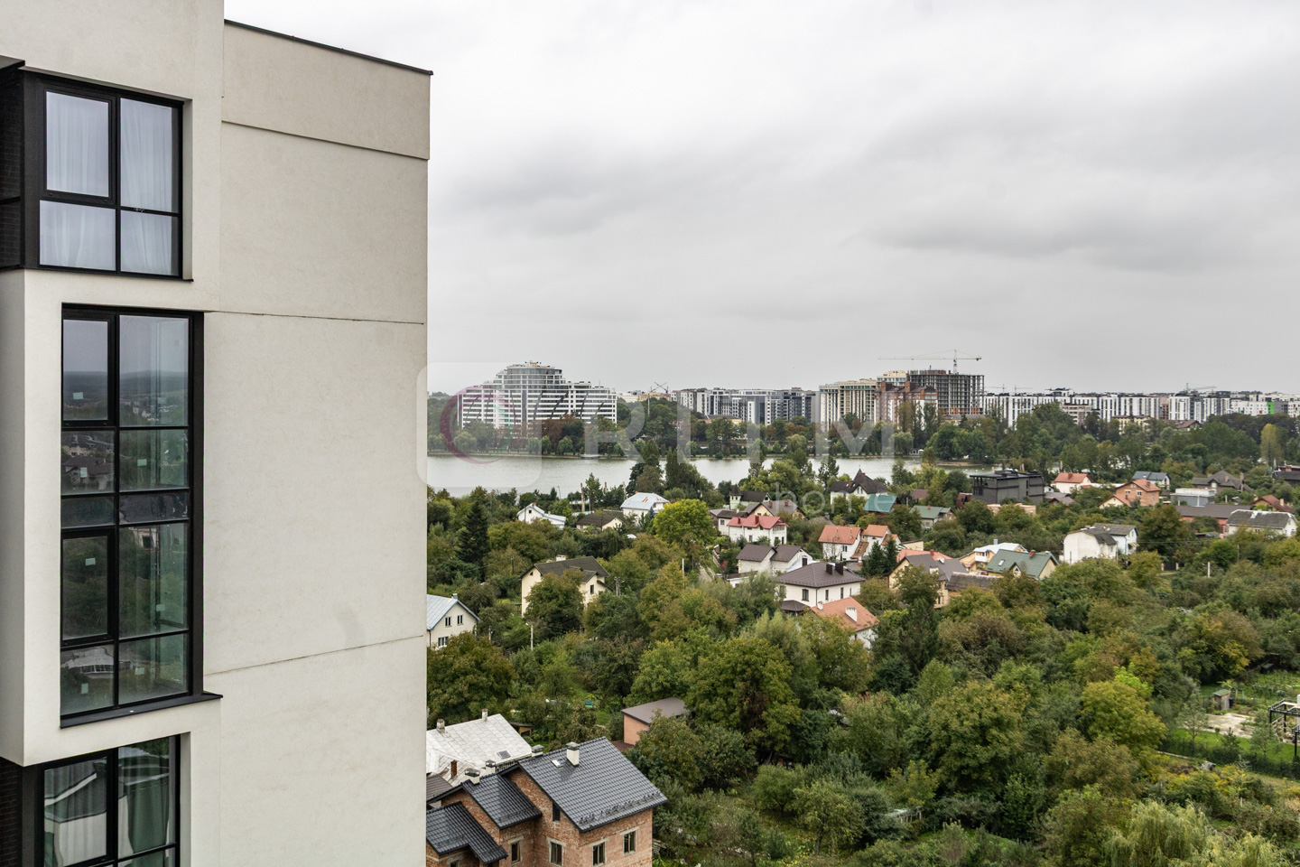 Кухня-студія з відпочинковою зоною: великий диван біля панорамних вікон з чудовим виглядом на міське озеро, обідній стіл зі зручними стільцями, сучасна кухня з усією необхідною технікою (посудомийна машина, вбудована плита, духовка, витяжка, холодильник, мікрохвильова).