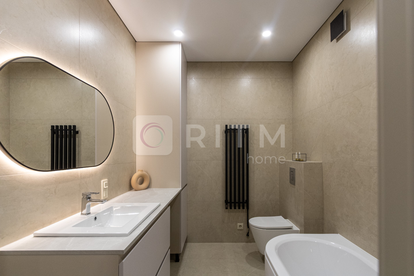 Ванна кімната: стильний санвузол з ванною, пральною машинкою, сучасною сантехнікою та підігрівом підлоги.