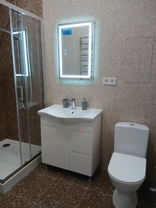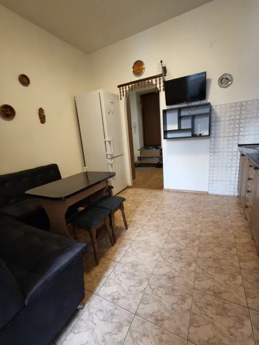 Компактна кухня обладнана технікою: холодильник, газова плита, духова шафа. Санвузол роздільний, є ванна та пральна машина.