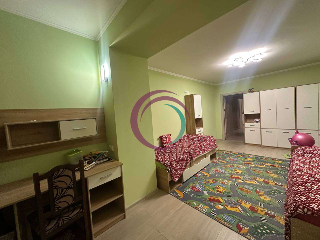 Дитяча кімната з двома ліжками, великою шафою-купе, тумбочками, а також лоджією, де розташовано додаткову шафу та стіл для навчання.