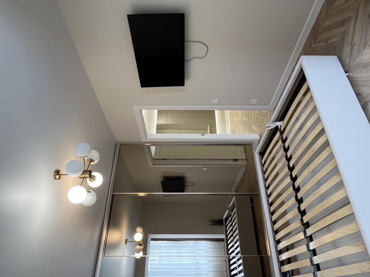 У спальні — двоспальне ліжко, тумбочки, телевізор і ще одна велика шафа-купе.