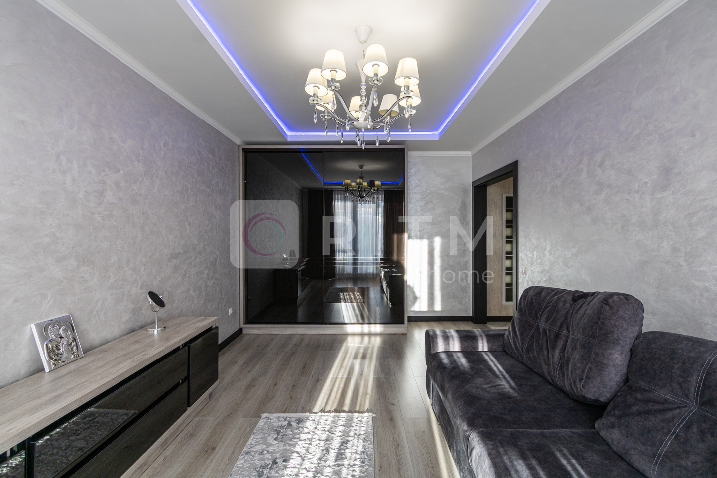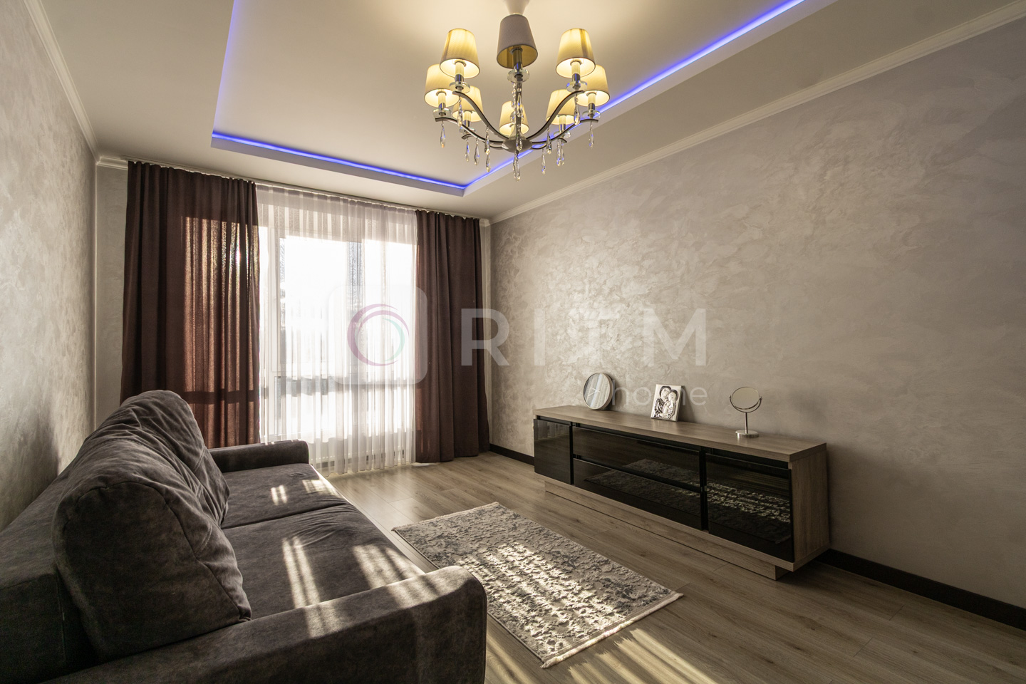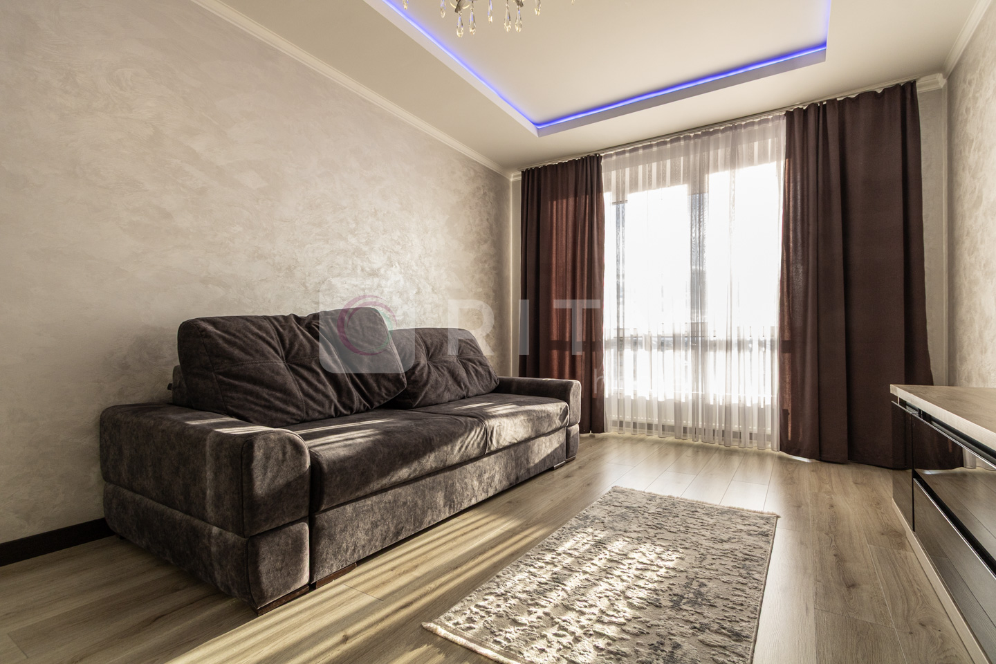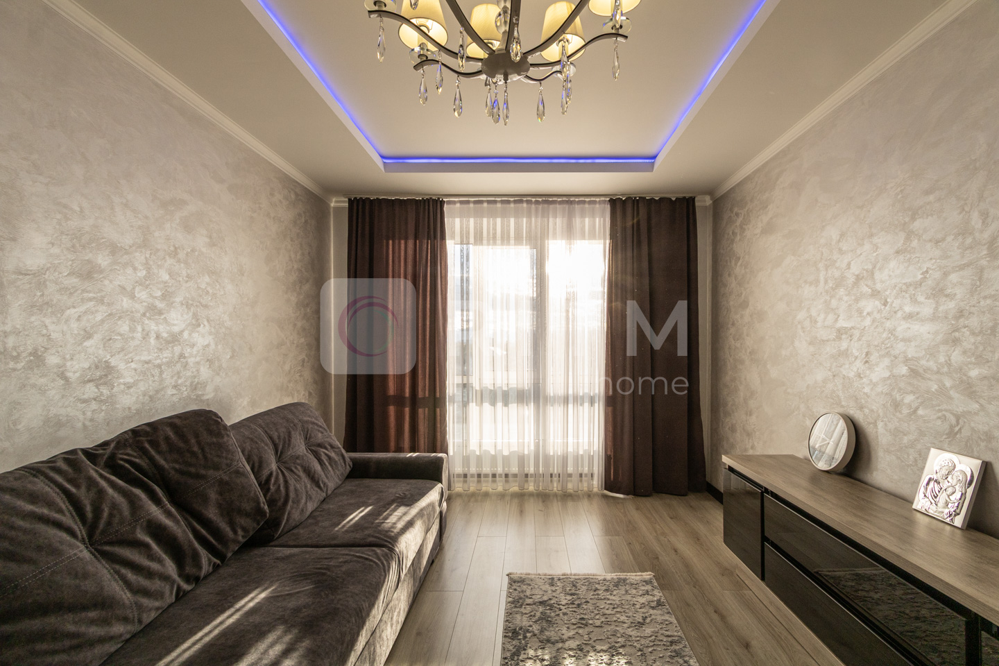 Вітальня — велика, простора та надзвичайно світла завдяки панорамним вікнам. Тут є зручний диван для приємного перегляду фільмів та велика шафа для гардеробу.