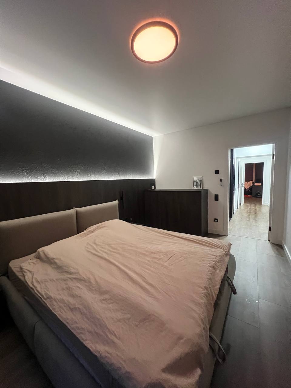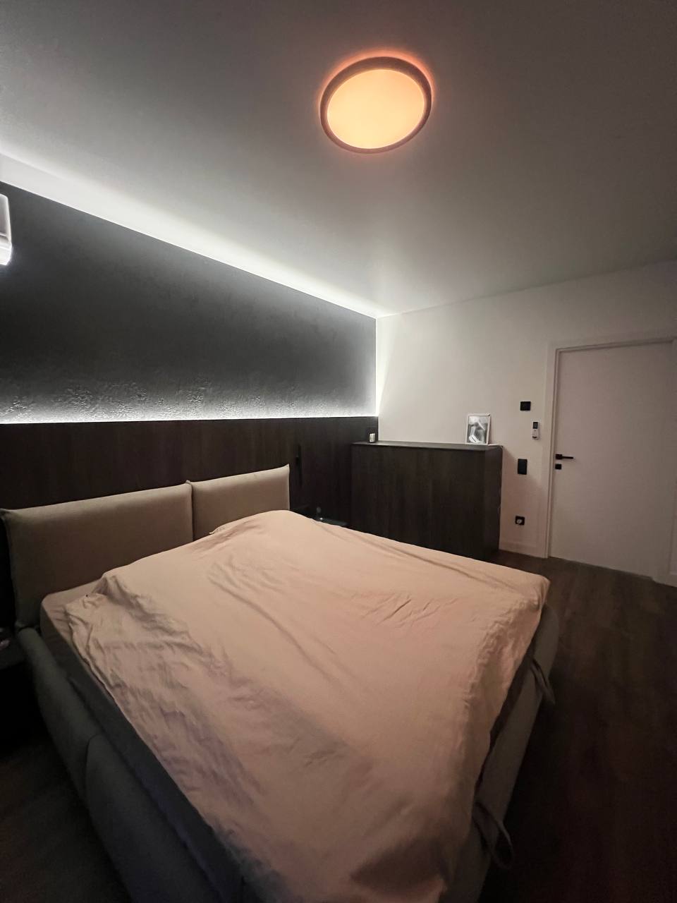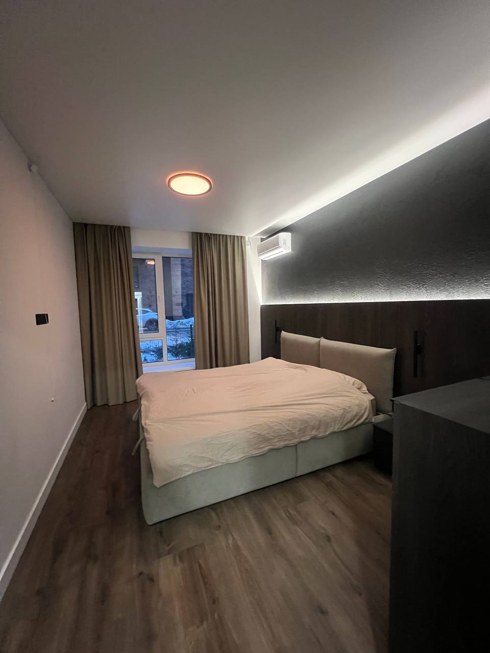 Друга кімната — велике двоспальне ліжко з ортопедичним матрацом, кондиціонер, комод, декоративна підсвітка.