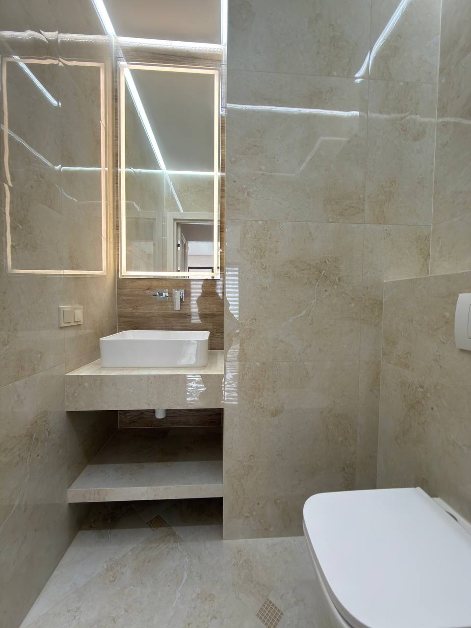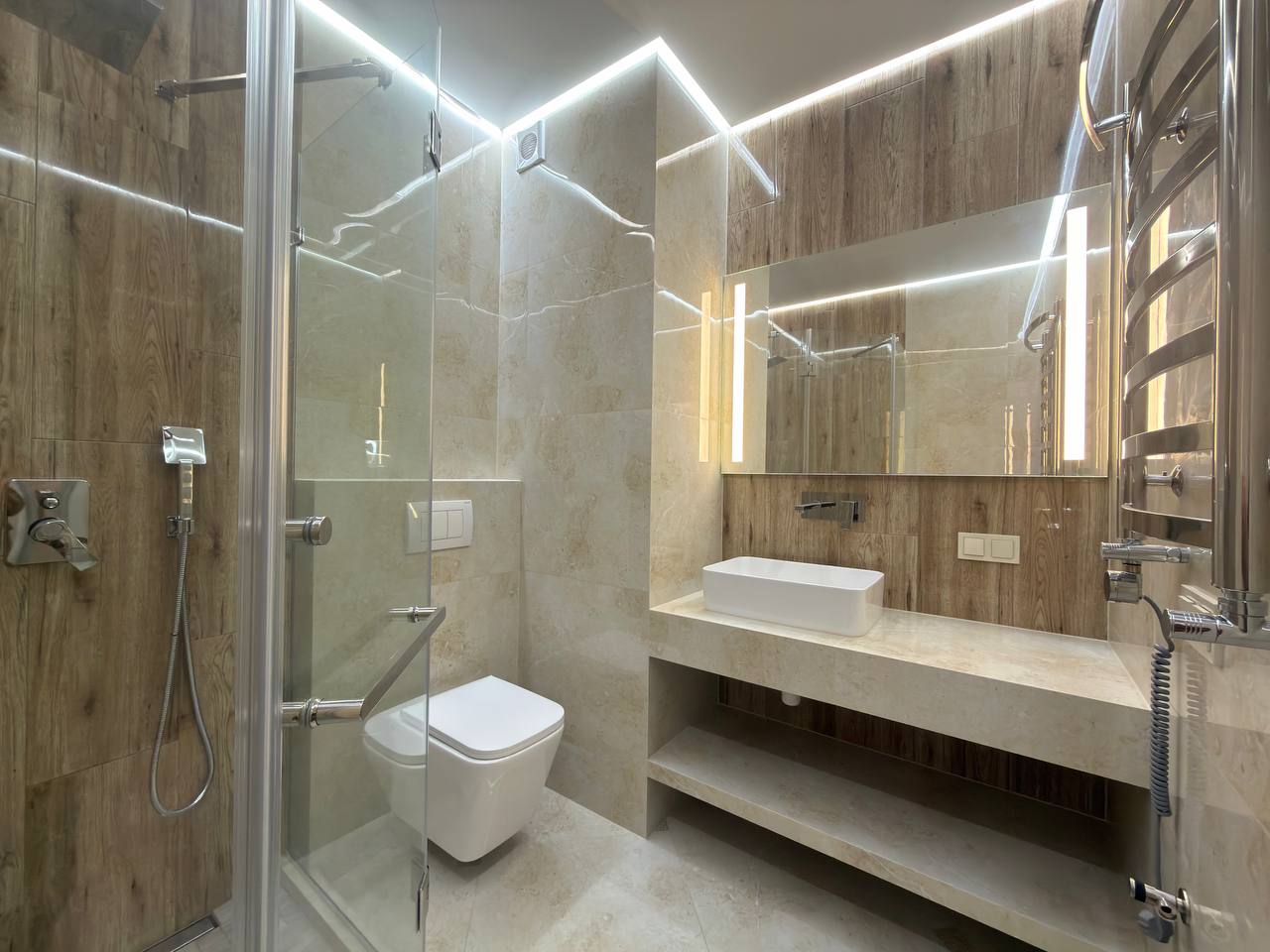 Планування максимально комфортне: окрема ванна кімната з сучасною душовою кабіною, великим дзеркалом із підсвіткою та якісною сантехнікою, а також окремий санвузол — зручно для сім’ї або гостей. По всій квартирі встановлений підігрів підлоги, що створює особливий комфорт у холодну пору року. У кожній кімнаті є кондиціонери — для ідеального мікроклімату в будь-який сезон.