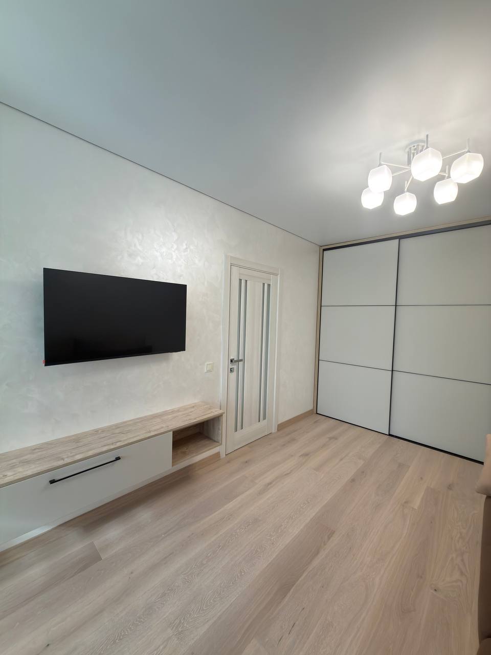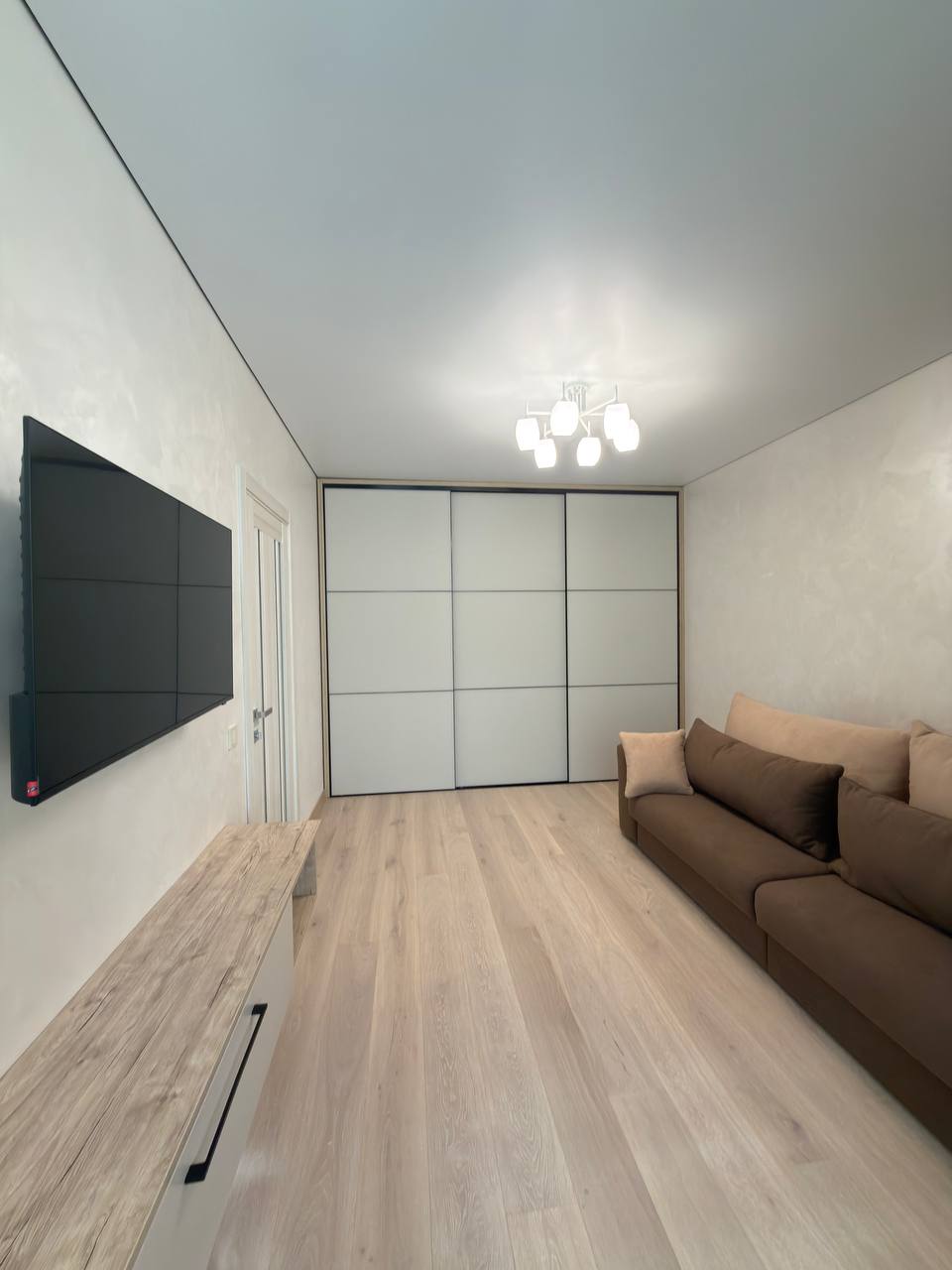 Вітальня — справжня родзинка квартири: багато простору, великий диван, двоспальне ліжко, простора шафа-купе, телевізор та кондиціонер. Кімната наповнена світлом і має атмосферу затишку та комфорту.