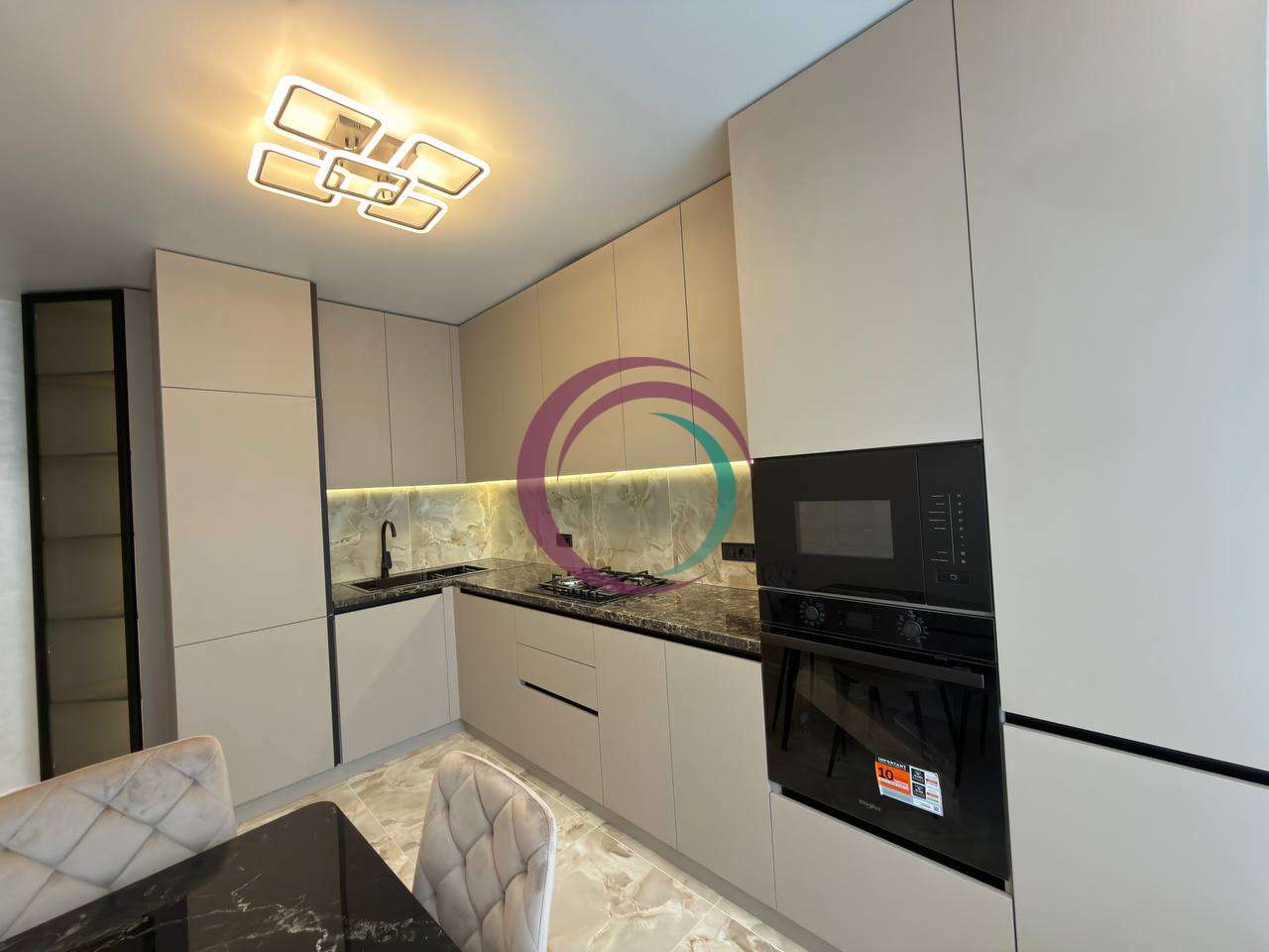 Кухня повністю укомплектована якісною вбудованою технікою, є вмонтований холодильник, обідній стіл та стільці.