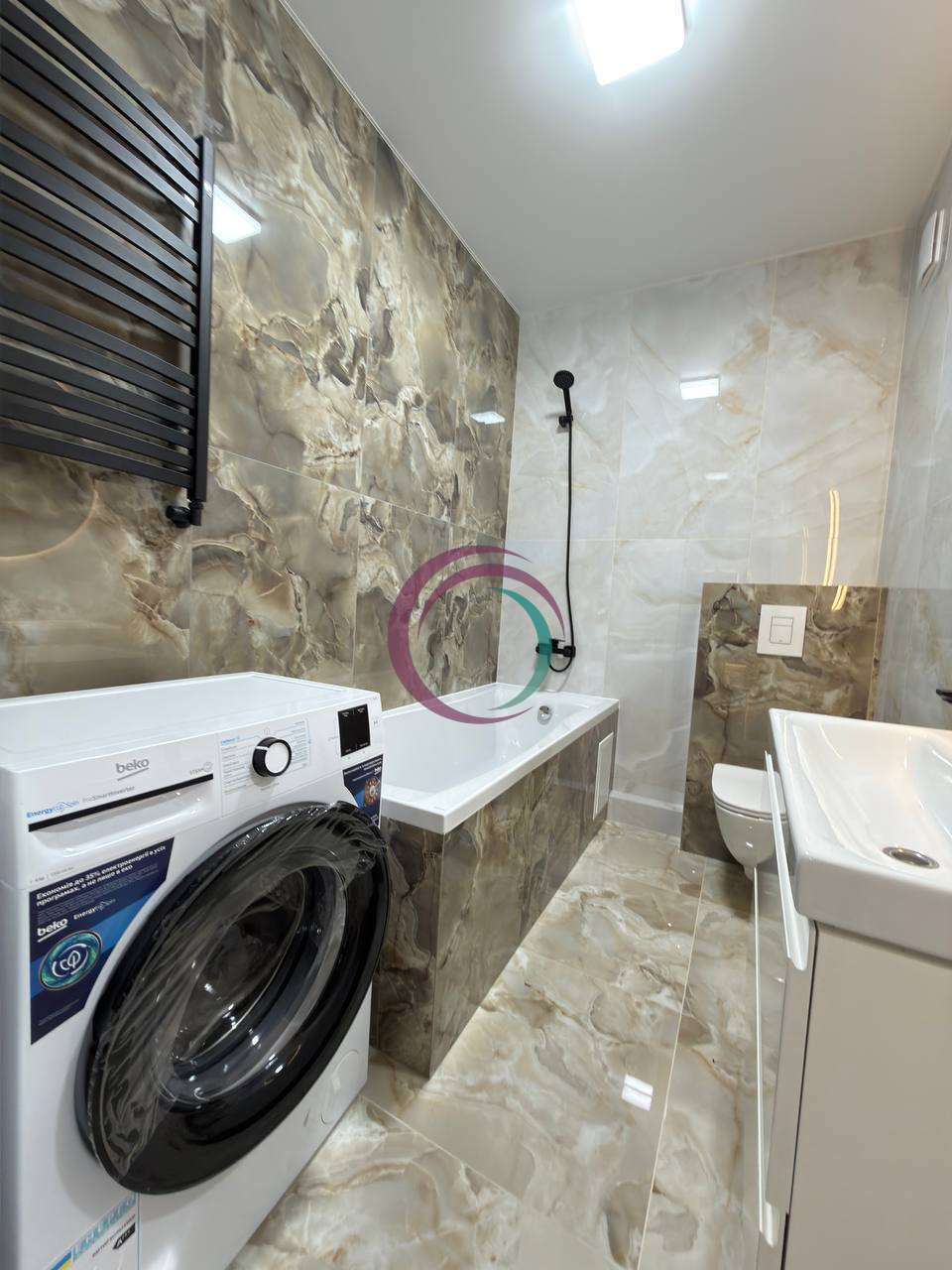 У ванній кімнаті встановлено ванну, санвузол, умивальник, пральну машину та дзеркало з підсвіткою.