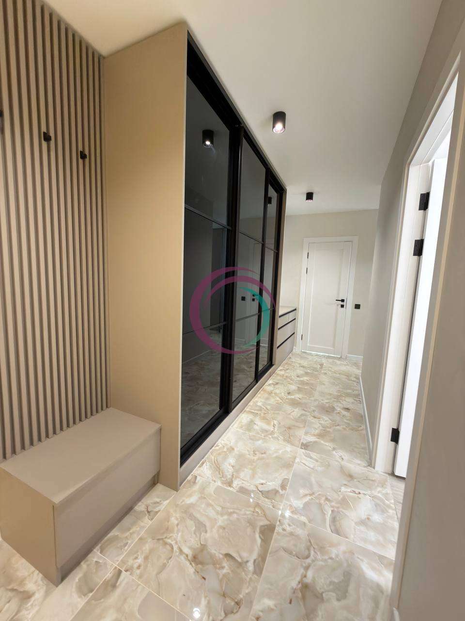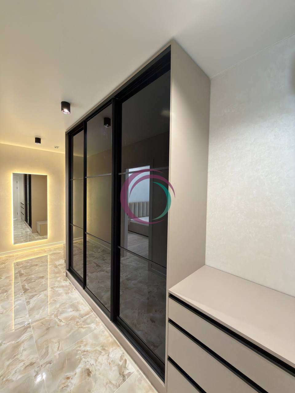 Квартира має просторий коридор з великою шафою-купе, зоною прихожої та великим комодом, що забезпечує багато місця для зберігання.