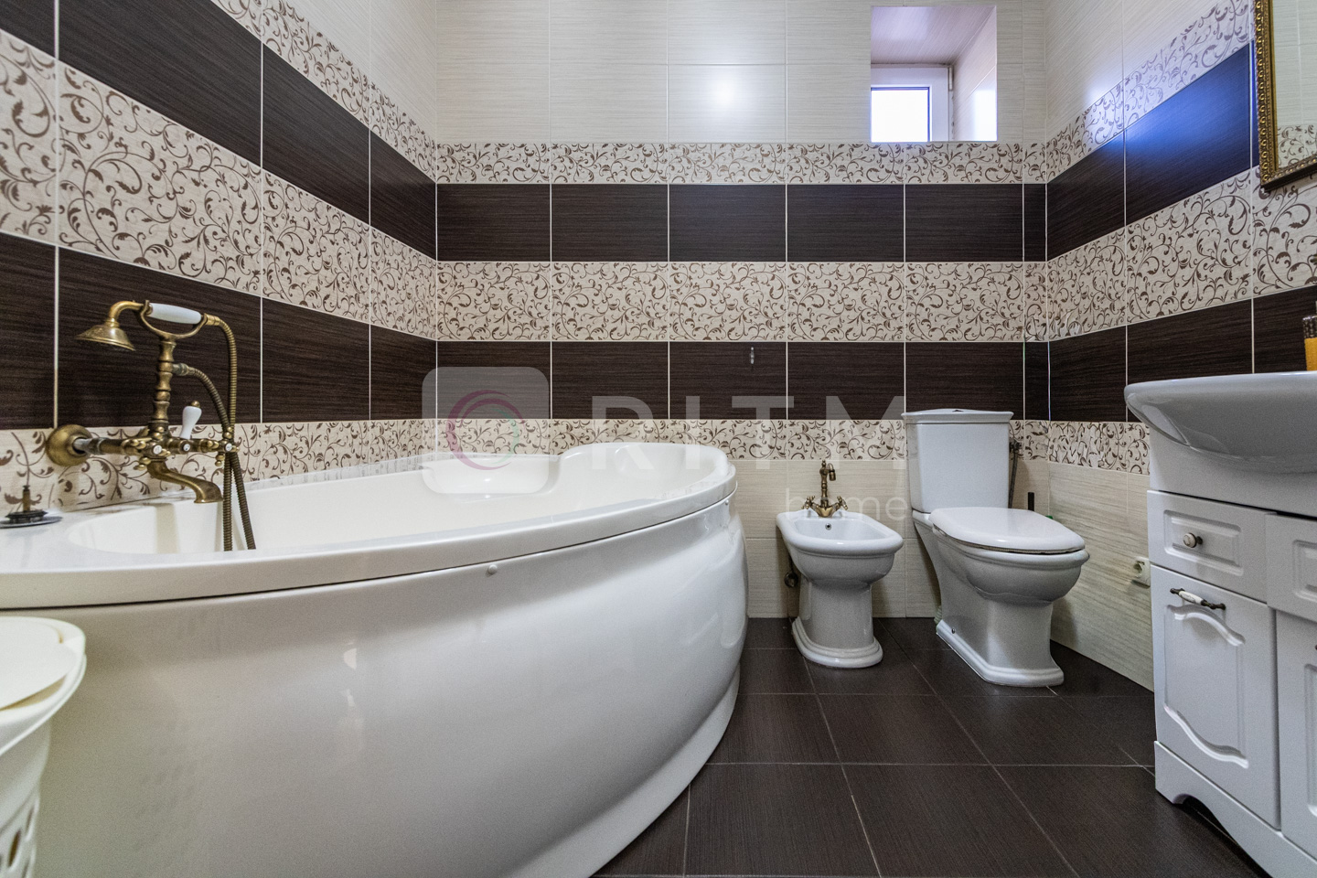 Ванна кімната простора, з великою зручною ванною, виконана у сучасному стилі.