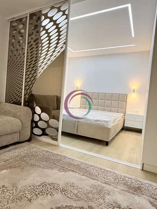 Окремо варто відзначити наявність гардеробної кімнати, що дозволяє зручно організувати речі, та велике дзеркало з підсвіткою, яке додає інтер’єру вишуканості.