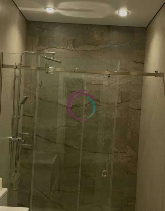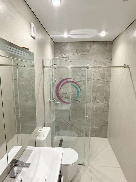 Санвузол виконаний у світлих відтінках із використанням мармурових елементів. Оснащений сучасною душовою кабіною, сантехнікою високої якості та системою зручного зберігання.