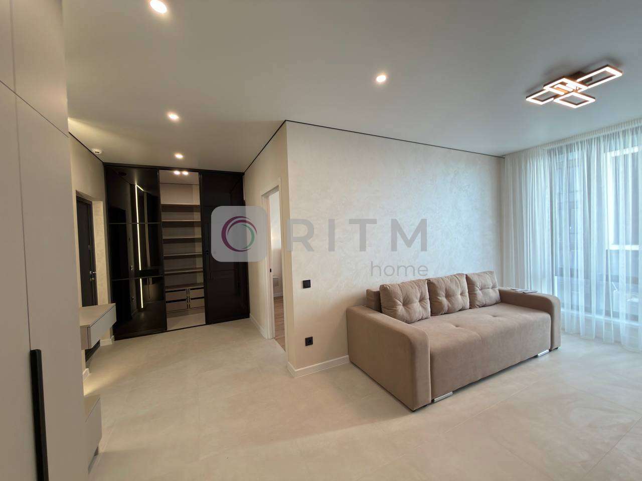 Передпокій у квартирі дуже просторий і додатково облаштований розкладним диваном для гостей та ще одним телевізором, що створює окрему комфортну зону для відпочинку. У коридорі встановлена містка шафа-купе для додаткового зберігання речей.