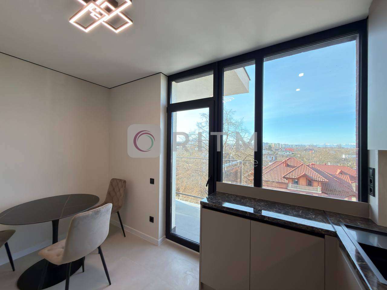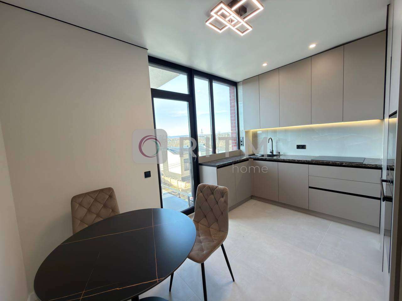 Кухня-студія виконана в сучасному стилі та повністю укомплектована всією необхідною технікою. Тут є обідній стіл, посудомийна машина та якісні кухонні меблі. З кухні є вихід на великий просторий балкон, де можна насолоджуватися ранковою кавою або вечірнім відпочинком з прекрасним видом на озеро та гори.