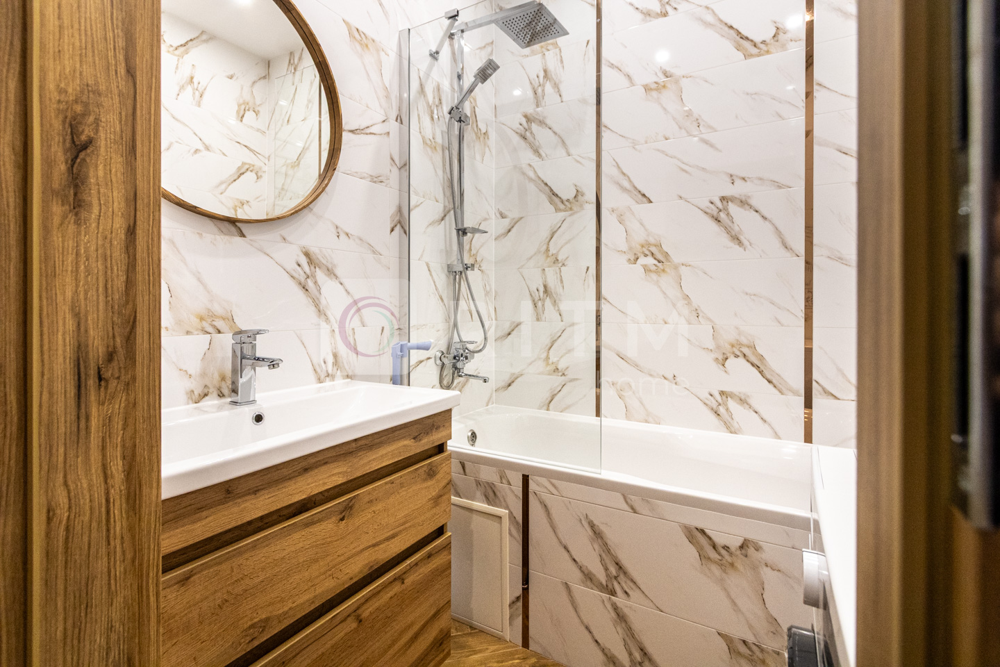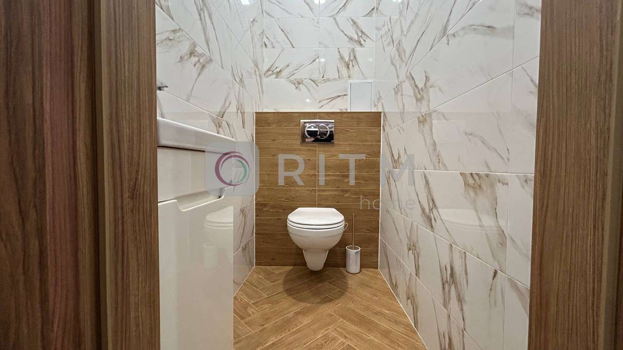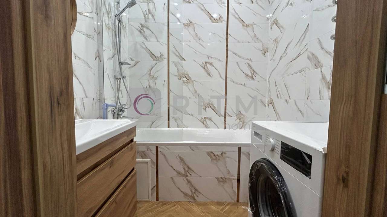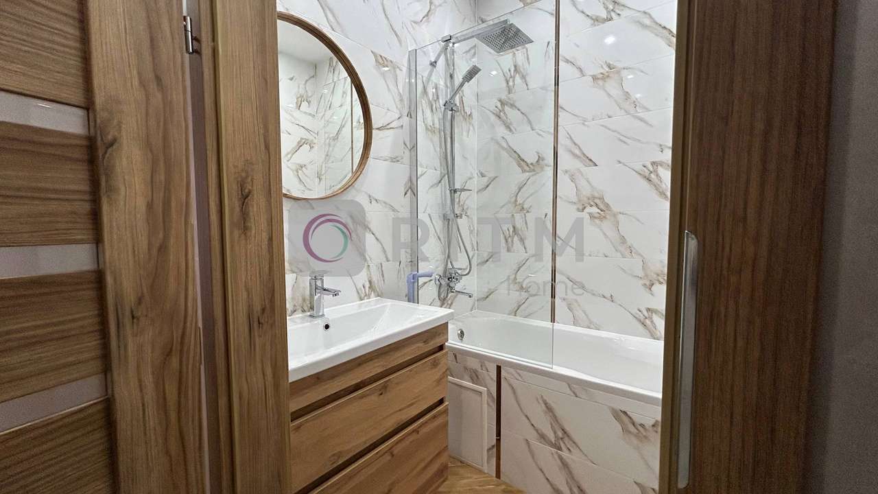 Санвузол сучасний, з ванною, виконаний у стильній плитці. Інтер’єр квартири виконаний у світлих теплих тонах, що створює атмосферу затишку та комфорту.