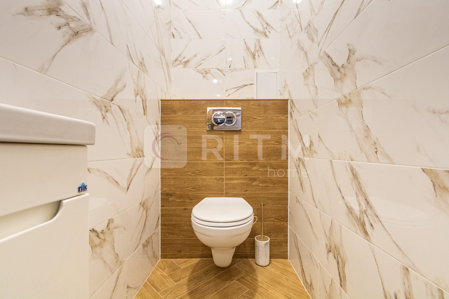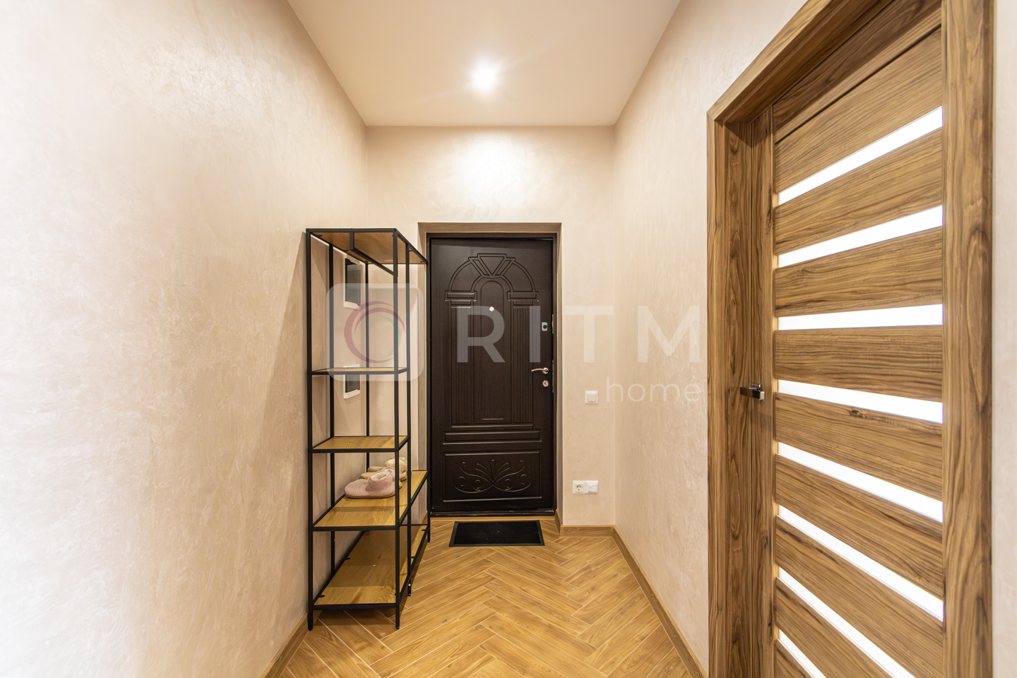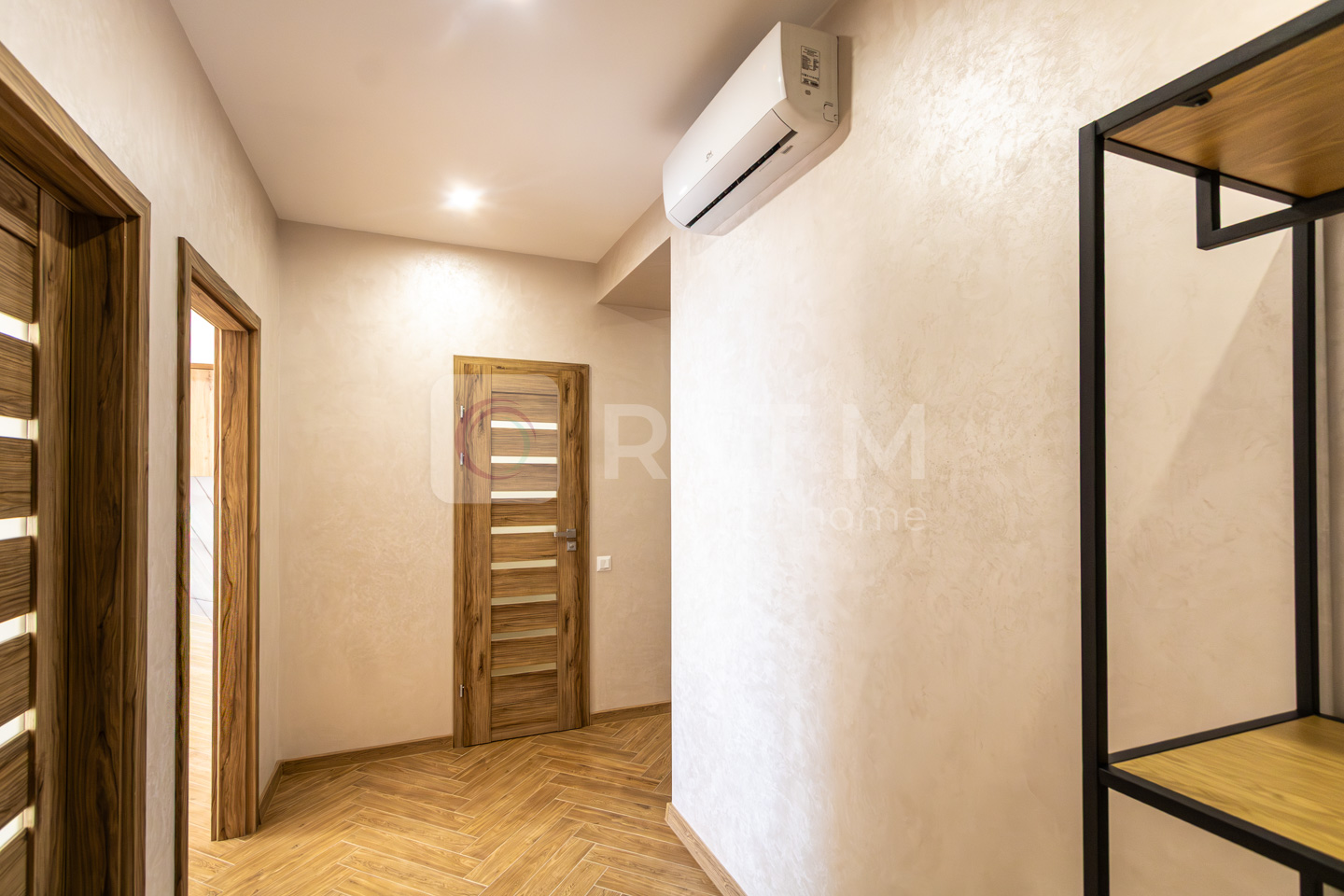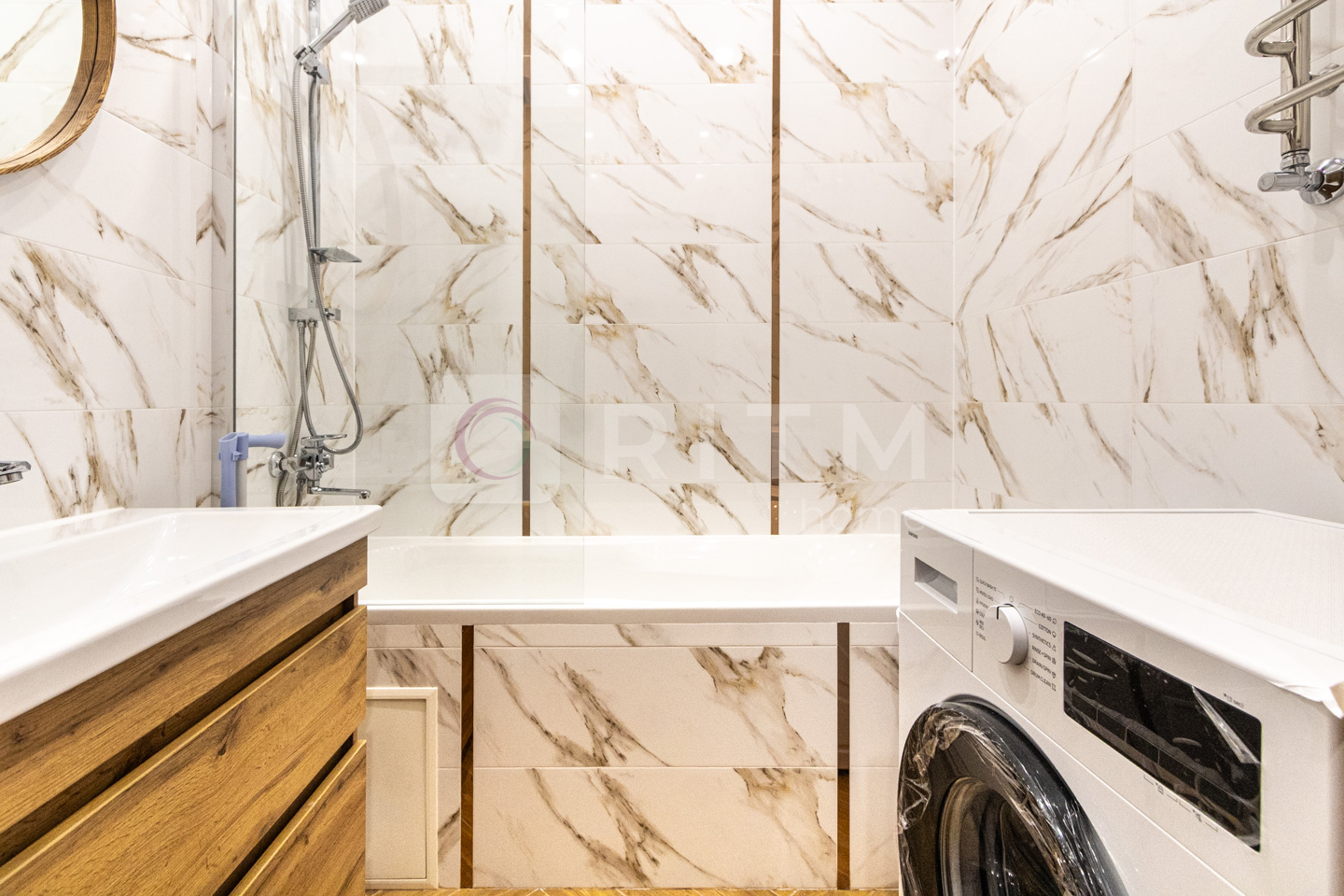 Санвузол сучасний, з ванною, виконаний у стильній плитці. Інтер’єр квартири виконаний у світлих теплих тонах, що створює атмосферу затишку та комфорту.